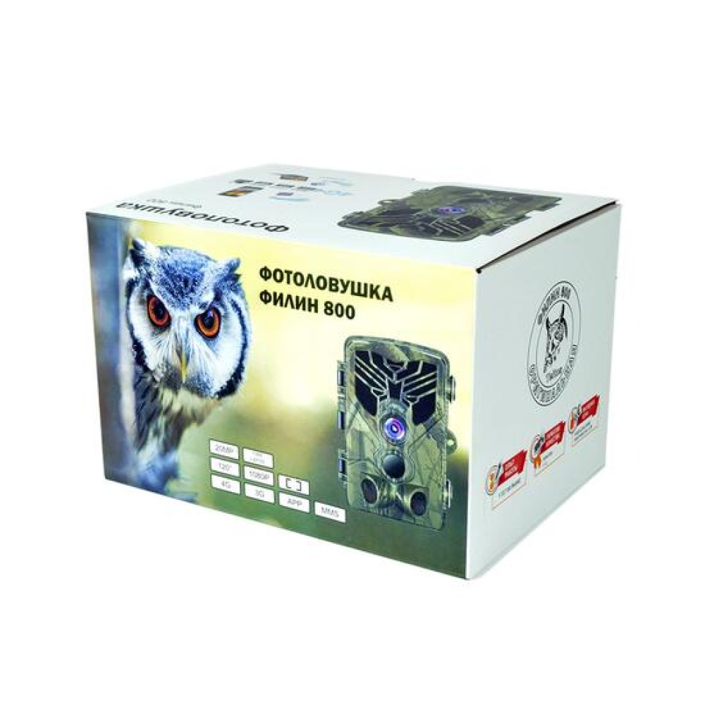Преимущества устройства: Самая быстрая скорость: используя 4G сети, фотоловушка мгновенно отправит Вам отснятый материал на телефон или электронную почту;Отправка фото: встроенный модуль связи позволяет фотоловушке дистанционно отправить фото на телефон по ММС, либо с помощью e-mail сообщения на электронную почту;Дистанционное управление: фотоловушкой с модулем связи можно удаленно управлять с помощью СМС команд: снять фото, переслать отчет, посмотреть остаток заряда и многое другое;Широкий угол обзора: Модель имеет современную камеру с широким углом обзора, что позволяет захватывать больше информации на кадре по сравнению с другими моделями;Три датчика движения: устройство оснащено тремя разнонаправленными датчиками движения, что позволяет захватывать движение во всем диапазоне работы камеры;Современная камера: обновленная камера может делать снимки разрешением 20 МП и видео 1080p (FullHD), что дает гораздо больше детализации и мелочей в кадре;Расширенная светодиодная панель: Модель Филин 800 LTE имеет увеличенный до 36 шт блок светодиодов, поэтому его подсветка работает дальше и светит ярче, а затемненное стекло делает эту фотоловушку незаметной для глаз даже на максимальной яркости.Круглосуточная работа: модель оснащена инфракрасными светодиодами высокой мощности, что делает возможным работу фотоловушки в полной темноте и невидимую для человека подсветку объекта до 30 метров;Встроенный экран: лесная камера (фотоловушка) обладает встроенным цветным экраном диагональю 2 дюйма, благодаря которому можно как производить настройку на месте установки, так и просматривать отснятые материалы;Современное ПО: на устройстве устанавливаются прошивки самых последних версий на русском языке, которые позволяют производить широкую настройку фотоловушки: интервалы между снимками, мультисъемка, работа по расписанию и т.д.;Питание: модель может быть запитана от 3-х типов источников питания: батареи АА 8 шт, или внешний аккумулятор 6-12 В, либо с помощью адаптера питания на 220 В;Защита: фотоловушка имеет встроенную защиту от воды и брызг IP65, благодаря чему можно не бояться оставлять устройство на открытом воздухе;Гарантия и сервис: на все товары в нашем магазине распространяется гарантия 1 год, а наличие собственного сервисного центра позволяет решать 98% проблем в течении недели