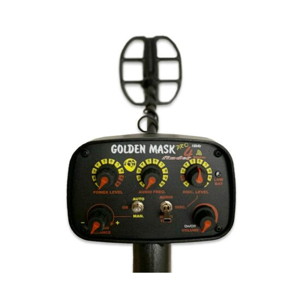 УРОВЕНЬ» контролирует степень отклонения железных предметов;«VOLUME» используется для запуска металлоискателя и определения громкости;«PHONES», если необходимо, включает монофонические наушники;индикатор «LOW BAT» для низкого напряжения батареи; Что у Вас будет в комплекте: Golden Mask 4 PRO 18 кГц, подлокотник, верхняя штанга с ручкой - 1х1х1 шт