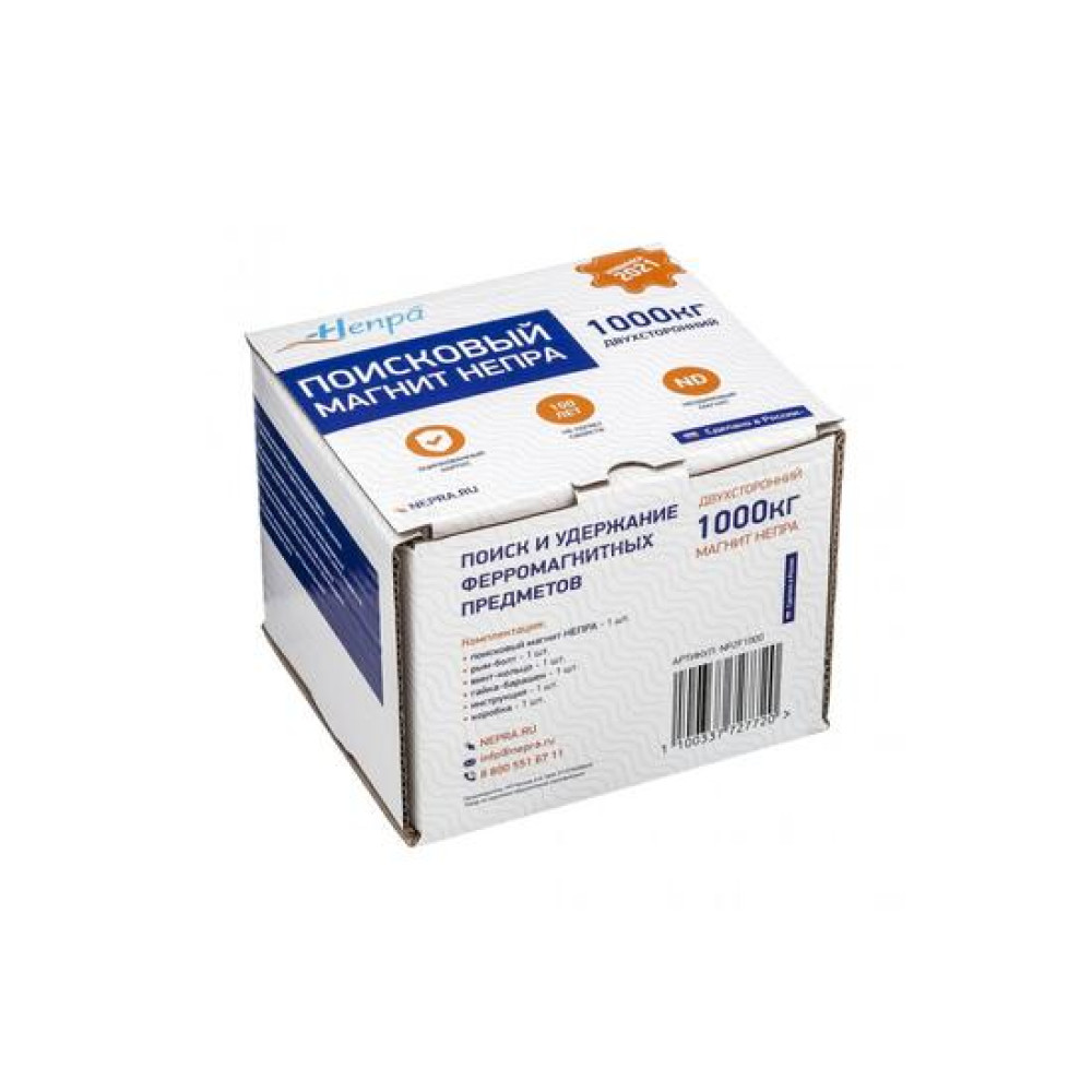 | Комплектация | Поисковый магнит НЕПРА 2F1000 - 1шт.; Винт-кольцо М12 - 1 шт.; Рым-болт М12 - 1 шт.; Гайка-барашек М12 - 1шт.; Инструкция - 1 шт.; Картонная коробка с фирменной полиграфией - 1 шт |