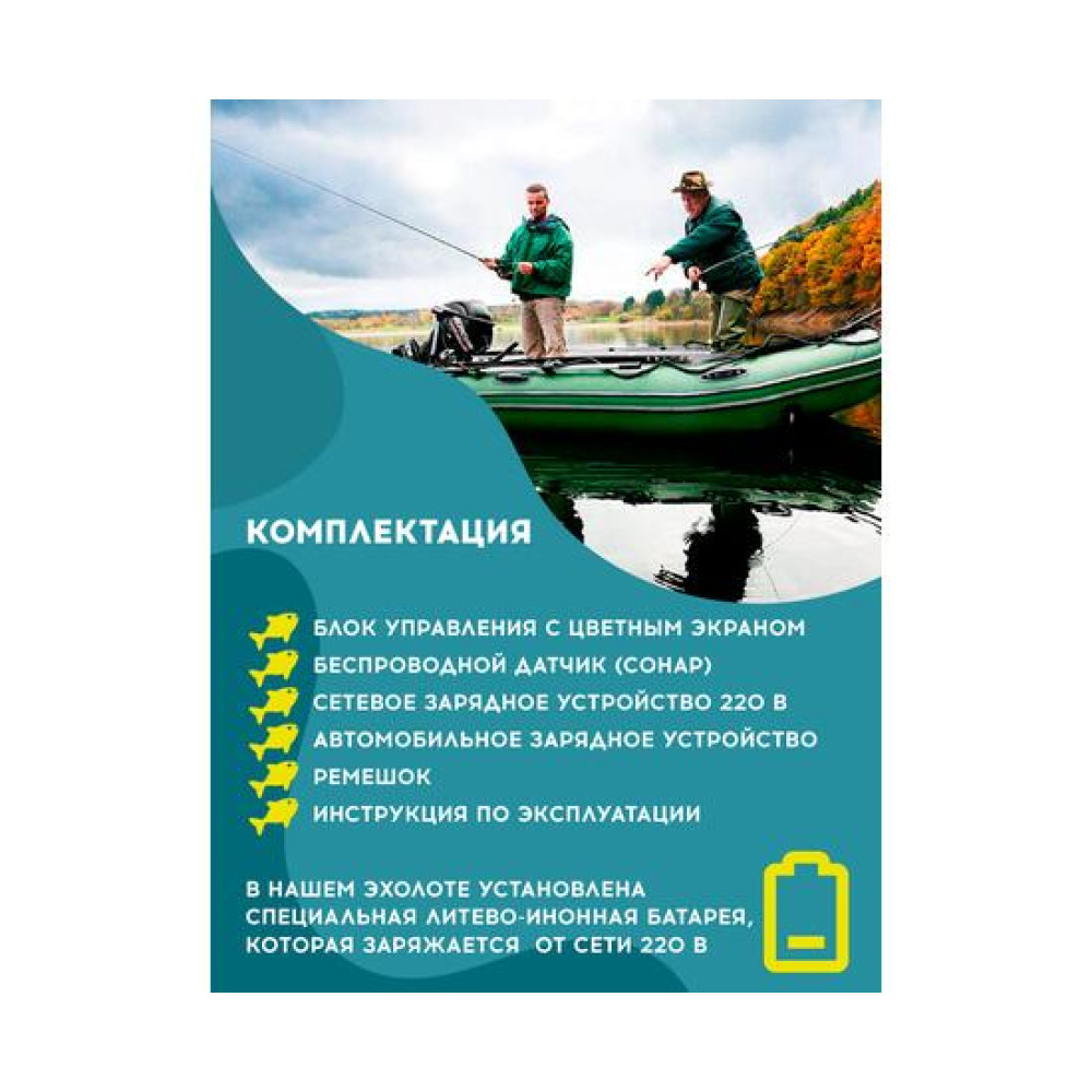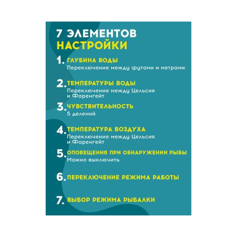 Технические характеристики: Регулируемый, высококонтрастный цветной ЖК-дисплей;Разрешение: 132х132;Размер дисплея: 41х48 мм;Подсветка экрана: Вкл./Выкл Белый светодиод;Дальность работы беспроводного датчика: до 180м;Угол и частота датчика: 90 градусов при 125 кГц;Единицы измерения температуры: Цельсий/Фаренгейт;Питание прибора: 3.7 V перезаряжаемые щелочные батареи;Индикатор заряда батареи;Настройка уровней чувствительности;Отображение иконки рыбы, сигнализации рыбы;Отображение рельефа дна;Единицы измерения расстояния Метр/Фут;Индикатор температуры воды;Пыле-влагозащищенный корпус;Встроенная память сохраняет пользовательские настройки если эхолот выключен;Автоматическое выключение беспроводного датчика при извлечении из воды;Питание беспроводного датчика: одна сменная СR-2032 литиевая батарея;Рабочая температура: от -20°С до +70°С