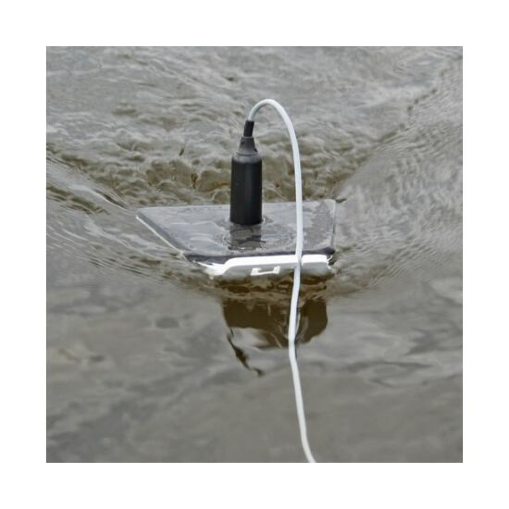 Эхолодка с установленным датчиком опускается на поверхность воды за борт плавсредства и буксируется за кабель