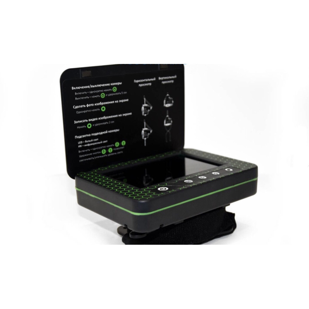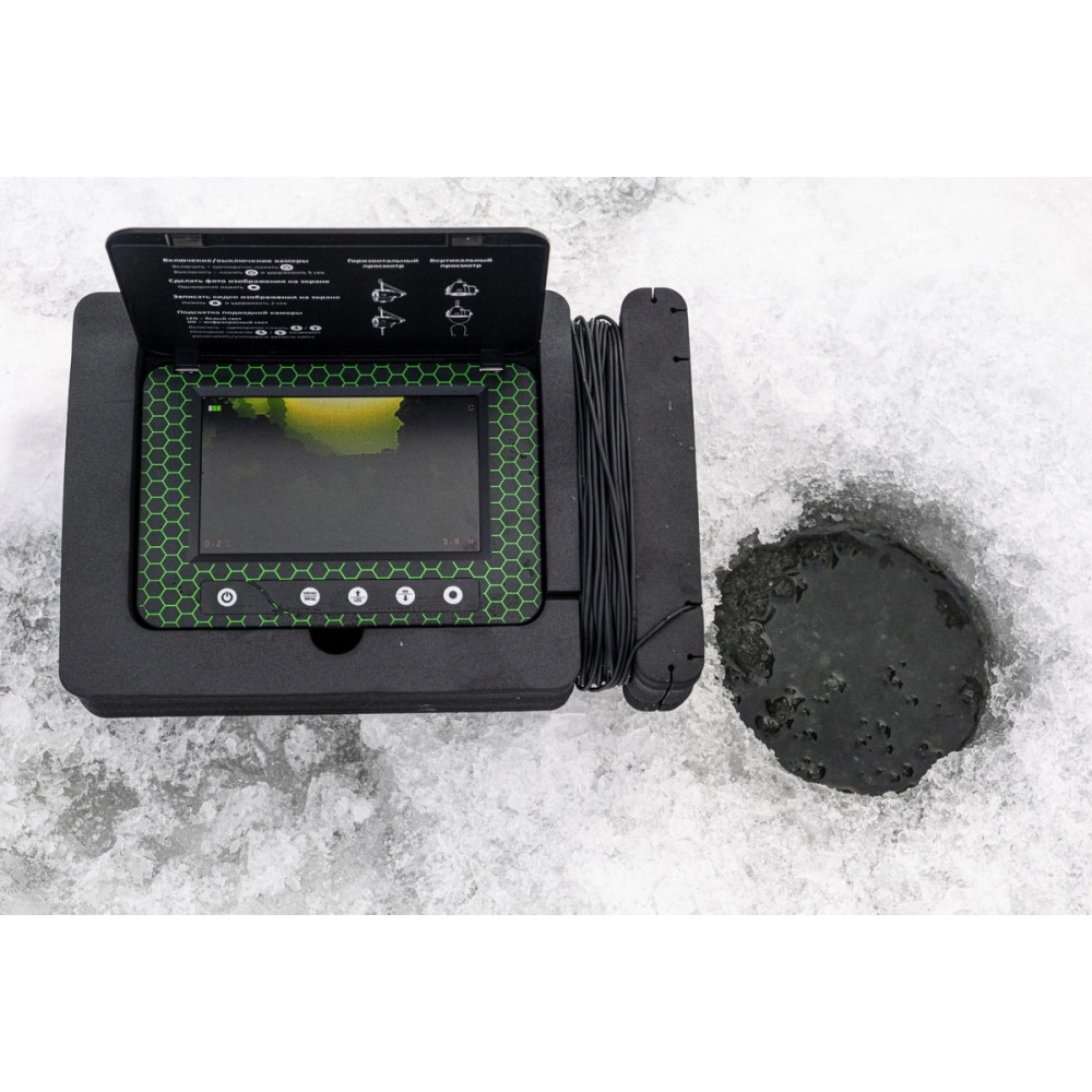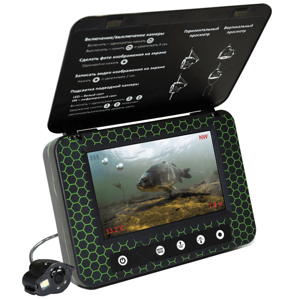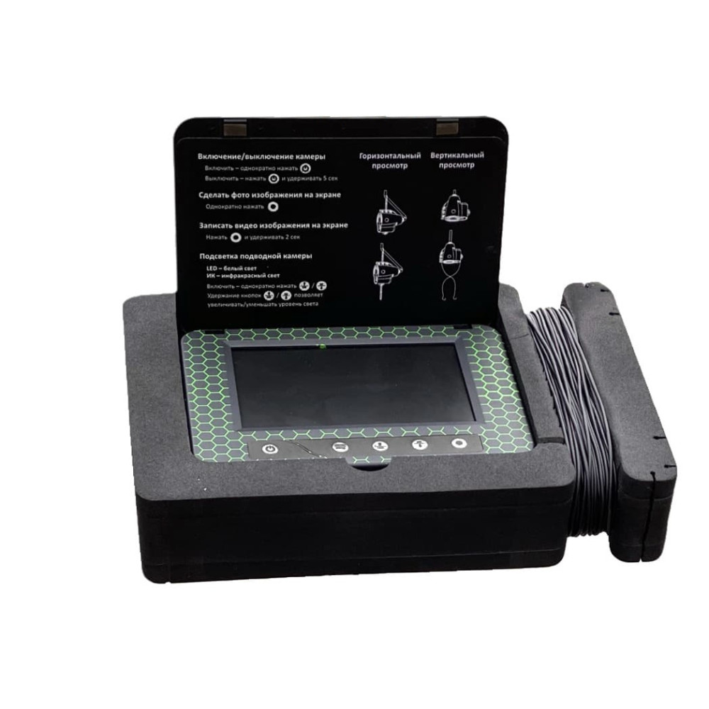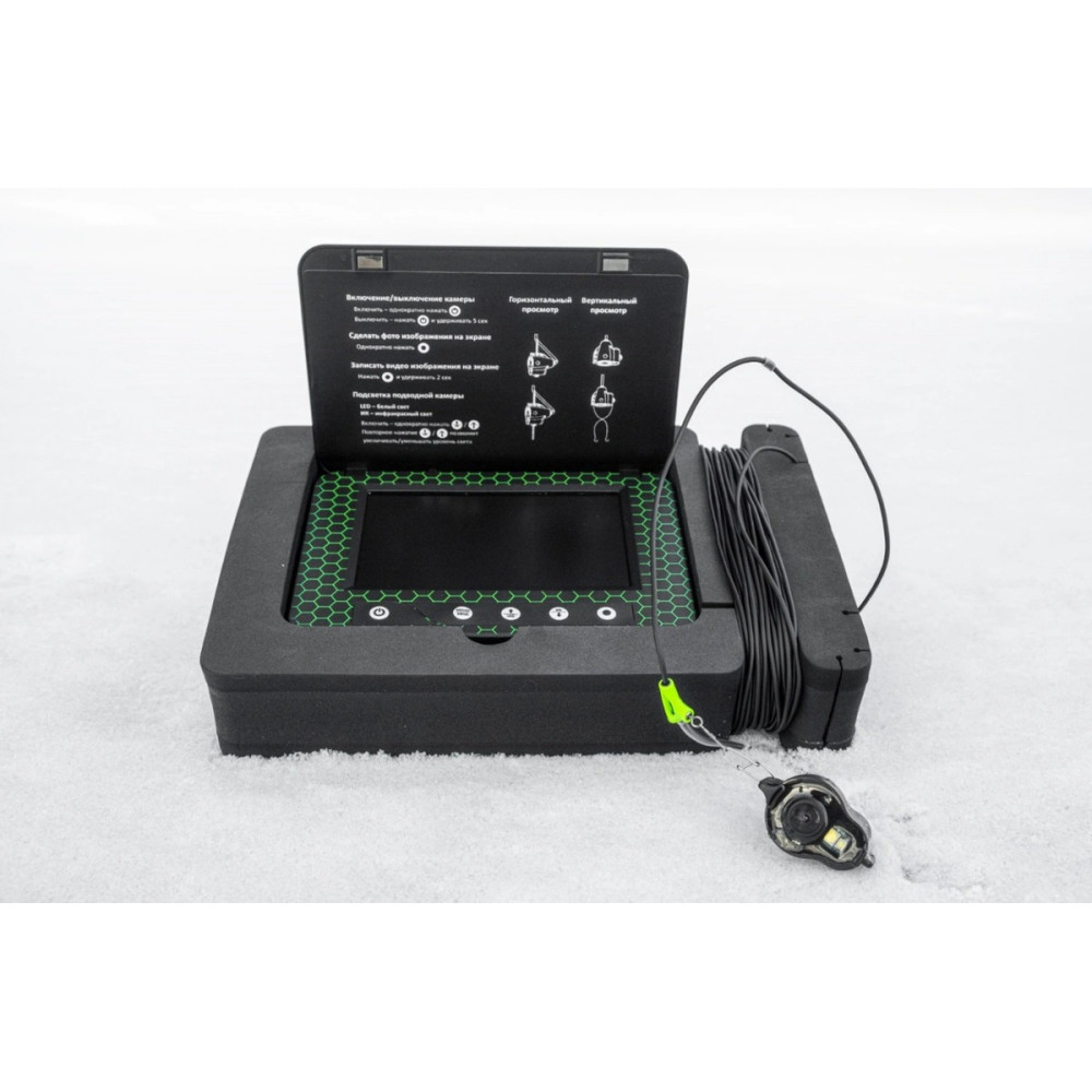 Переносной 5-дюймовый цветной TFT монитор с высоким разрешением 960х480 показывает четкую и яркую картинку даже на глубине 10-15 м при среднем уровне прозрачности воды. А наличие солнцезащитного козырька обеспечит отсутствие бликов на экране.