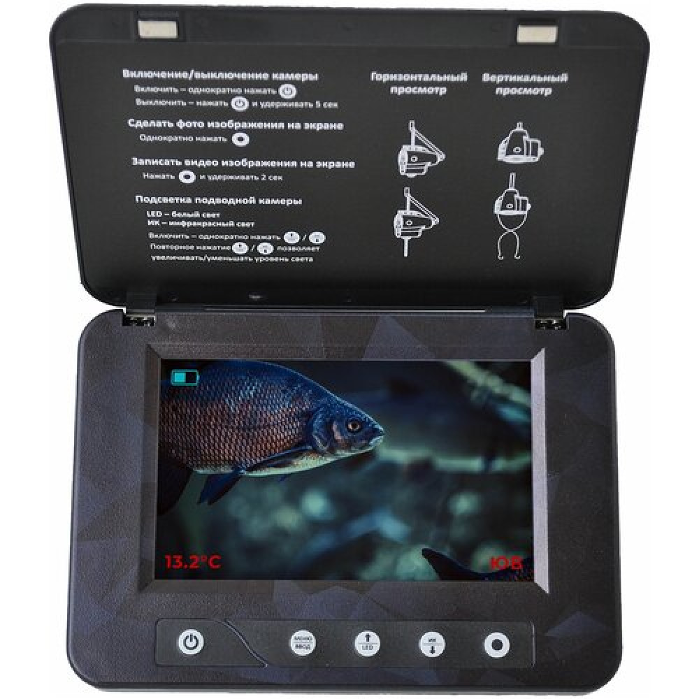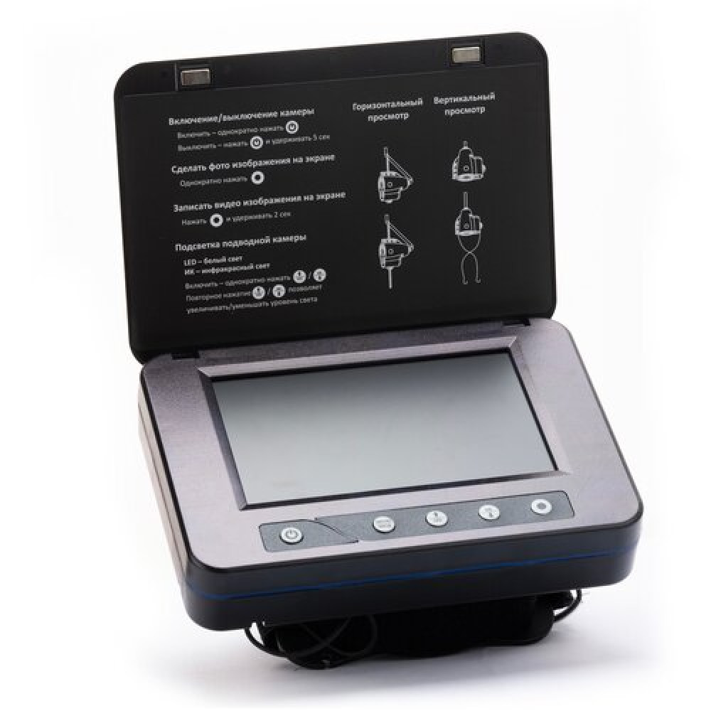 Переносной портативный 5-дюймовый цветной TFT-монитор подводной видеокамеры «Rivertech C5» имеет разрешение 960х480 пикселей. Такое высокое разрешение позволяет видеть четкую и яркую картинку даже на глубине 10-15 м при среднем уровне прозрачности воды. Наличие солнцезащитного козырька обеспечивает защиту от бликов на экране;