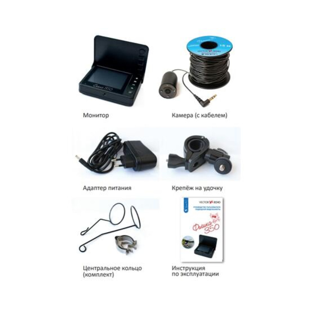 | Комплектация | Монитор; Камера с кабелем; Адаптер питания; Крепеж на удочку; Центральное кольцо (комплект); Инструкция |