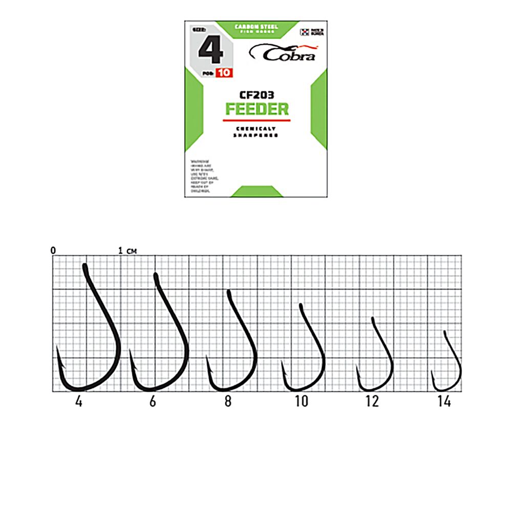 Бренд Cobra представляет серию фидерных крючков, специально разработанных ведущими мировыми спортсменами, для активной ловли рыбы на фидер. Крючки выполнены из высокоуглеродистой стали (Taff Wire), что делает их прочными и устойчивыми к нагрузкам. Крючки держат форму и не деформируются, даже при серьезных нагрузках, зацепах и на вываживании крупной рыбы. Новейшие технологии термообработки и электрохимическая заточка жала крючка позволяет использовать все виды насадок, даже самых капризные, такие как мотыль и опарыш. На производстве используется лазерный контроль качества заточки, что обеспечивает однородность всей выпускаемой продукции. Стойкое антикоррозийное покрытие.