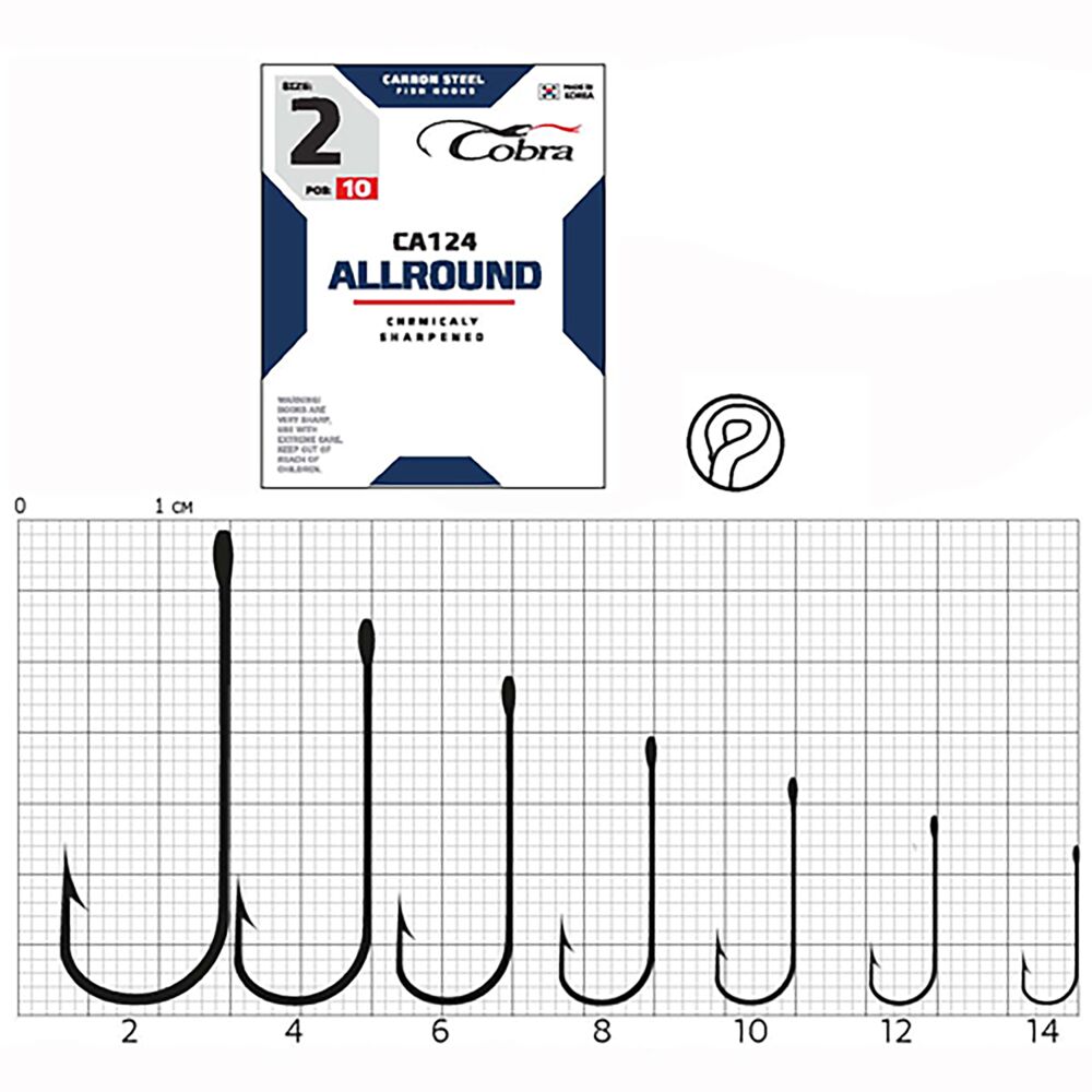 Бренд Cobra представляет серию крючков Allround. Серия крючков имеет среднее по размеру цевье и удлиненное жало с бородкой. Эти детали формы делают эти крючки универсальными в использовании. Особо актуально их использование при подборе крючка для ловли на незнакомом водоеме. Ими можно ловить практически на всех водоемах, со всеми типами насадок и по всем видам рыб. Главное - правильно подобрать размер крючка под условия ловли и ожидаемую рыбу. Представленный в серии широкий размерный ряд позволит осуществить этот процесс без проблем.