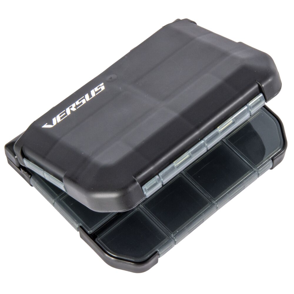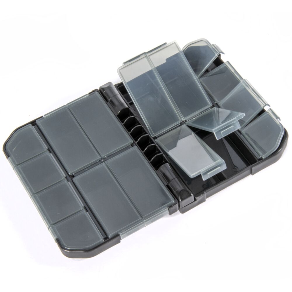 Коробка состоит из двух основных отделений, соединенных между собой шарнирными петлями. Внутри каждого большого отделения располагаются по 8 малых отделений двух размеров, каждое из которых имеет отдельную полупрозрачную крышку с защелкой. Отделения большего размера пригодны для силиконовых приманок до 2-х дюймов, блесен или балансиров. Мелкие отделения подойдут для хранения крючков, крепежных элементов, ушастых грузиков, микро джиг-головок или мормышек.