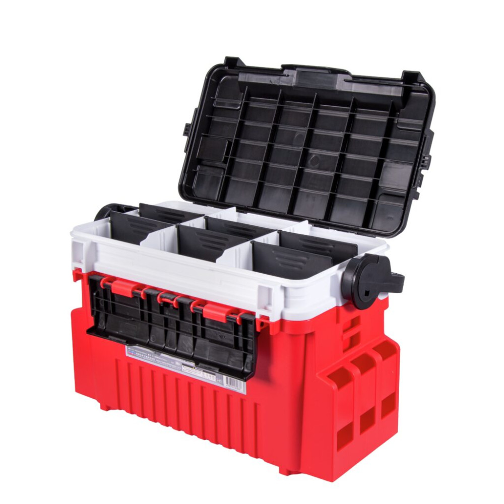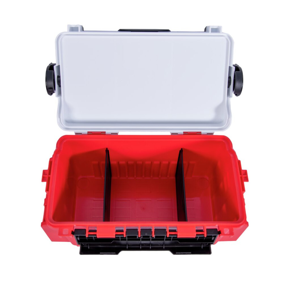 Под удобной крышкой находится поддон с перегородками, предназначенный для хранения приманок и оснасток. Перегородки можно перемещать по своему разумению, чтобы оптимально организовать пространство.