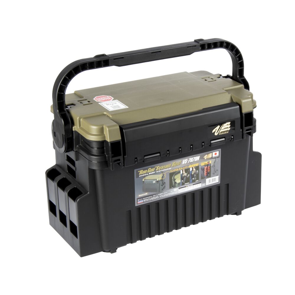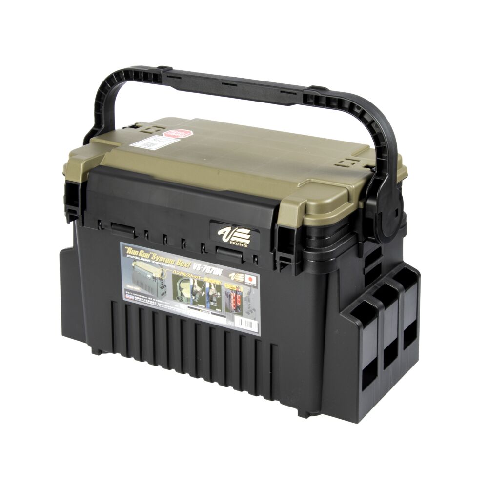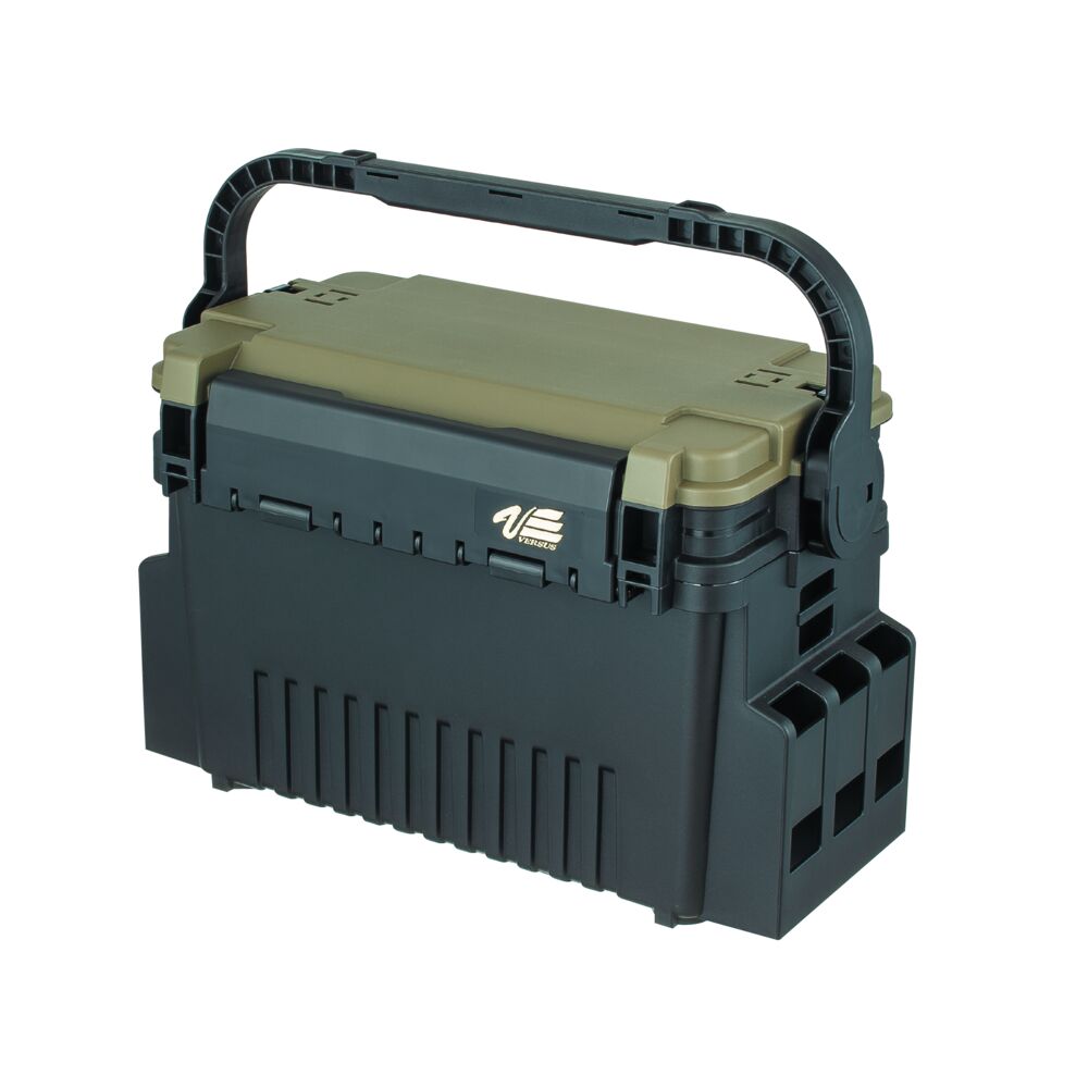 Ящик изготовлен из ударопрочного пластика в стильном агрессивном дизайне с зеленой крышкой. Он рассчитан на эксплуатацию в самых суровых условиях. По бокам имеются специальные фиксаторы: на ящик можно закрепить до четырех стаканов-держателей для удилищ Meiho серии BM.