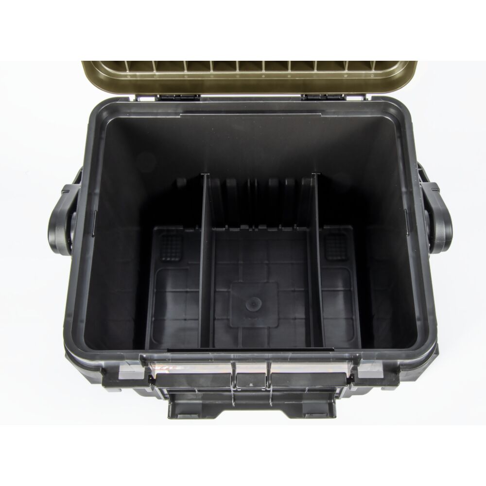 Под прочной откидной крышкой находится два лотка (можно снять и зафиксировать с внешней стороны ящика). Имеются устойчивые прорезиненные ножки, что наверняка оценят любители ловли с лодки. В комплектацию входят съемные перегородки.