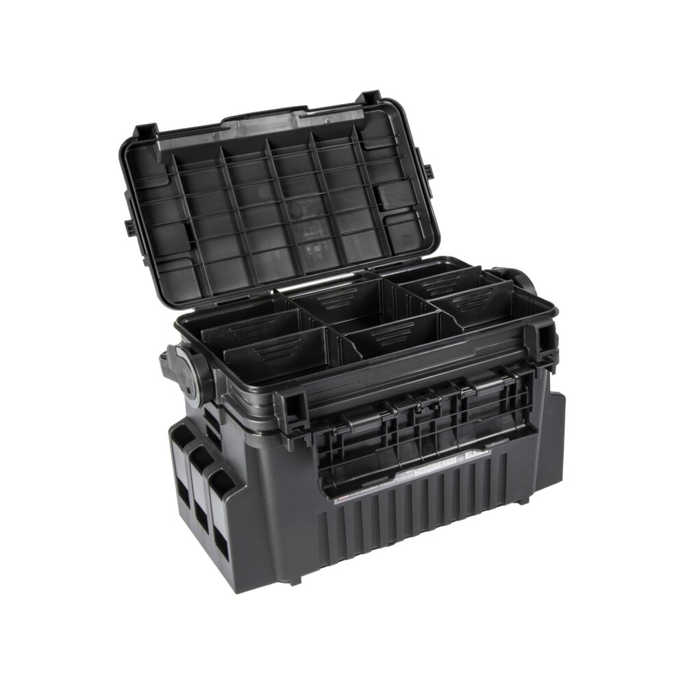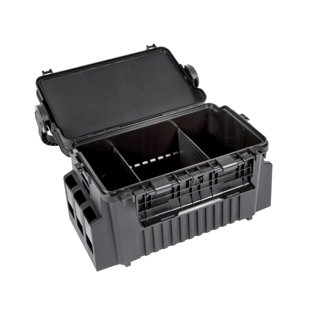 Большая ручка для переноски выполняет несколько функций. Если раскрыть ящик, она обеспечит упор для крышки, что позволит разложить элементы оснастки на столике с бортиком, откуда они не скатятся даже в ветреную погоду. Ручка служит блокиратором, который не даст раскрыться ящику в случае, если рыболов забудет опустить защелку.