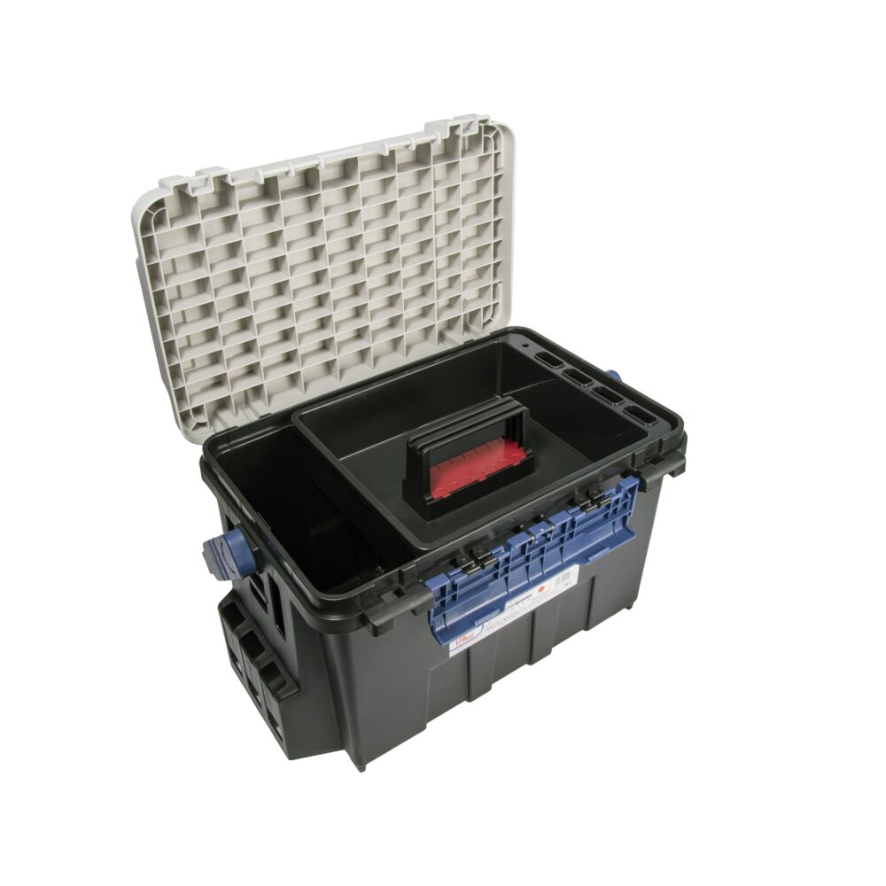 В качестве дополнения внутри имеется передвижной удобный лоток, в который можно положить принадлежности, и они будут в «быстром доступе». Размеры сдвижного лотка-вкладыша: 300x268x90 мм. Ящик имеет «фирменную фишку» Bucket Mouth – специальные замки, которые дают возможность открыть его с любой из двух сторон. Замки открываются и закрываются одной рукой, а сама крышка хорошо прилегает к корпусу и защищает содержимое ящика от дождя. Более того – ему не страшен даже «душ» от набегающих волн.