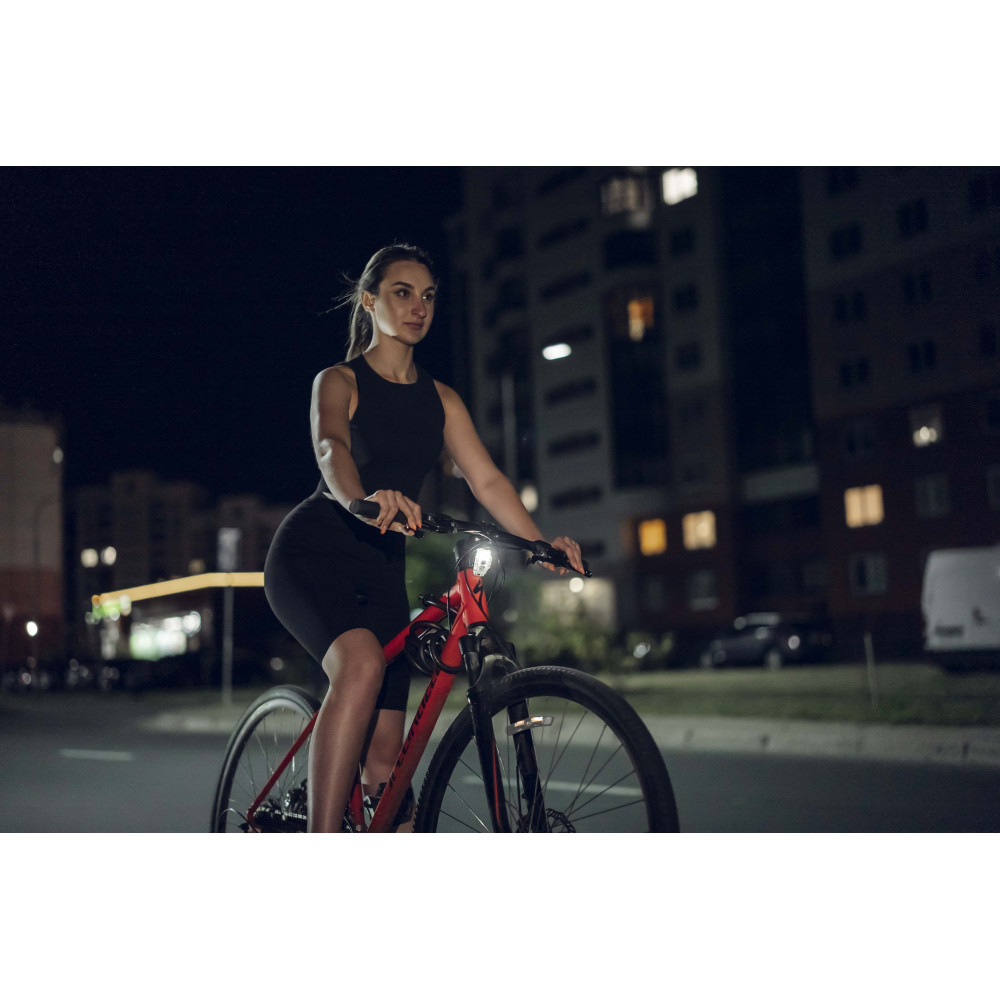 - Высокочувствительные датчики фиксируют торможение велосипеда, после чего включаются дополнительные красные светодиоды и яркость фонаря увеличивается до 43 лм