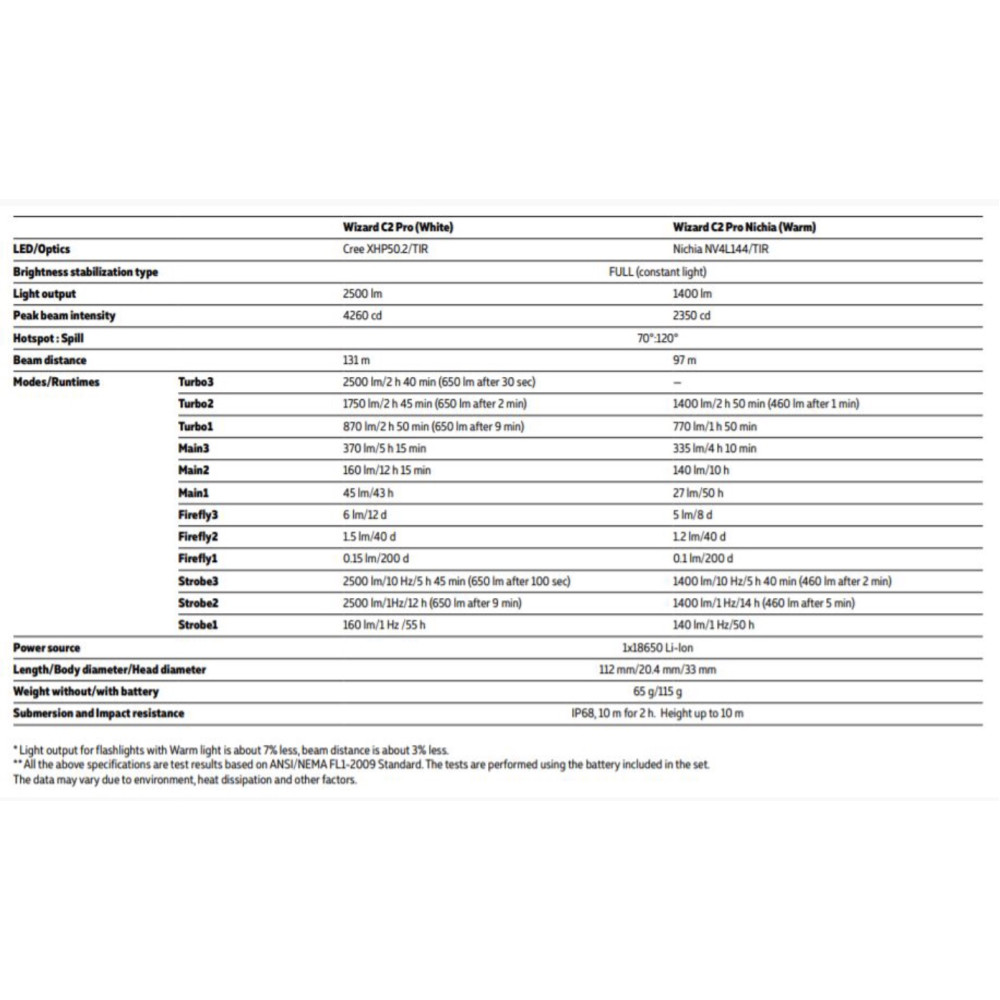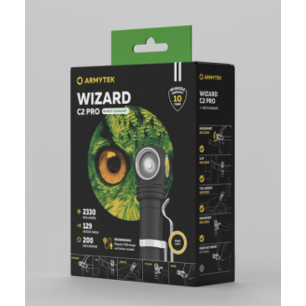 В комплект входит комфортное налобное крепление, клипса для фиксации на одежде или рюкзаке и велокрепление ABM-01. Wizard C2 Pro совместим с креплением на каску AHM-02 и подходит для строительных работ.