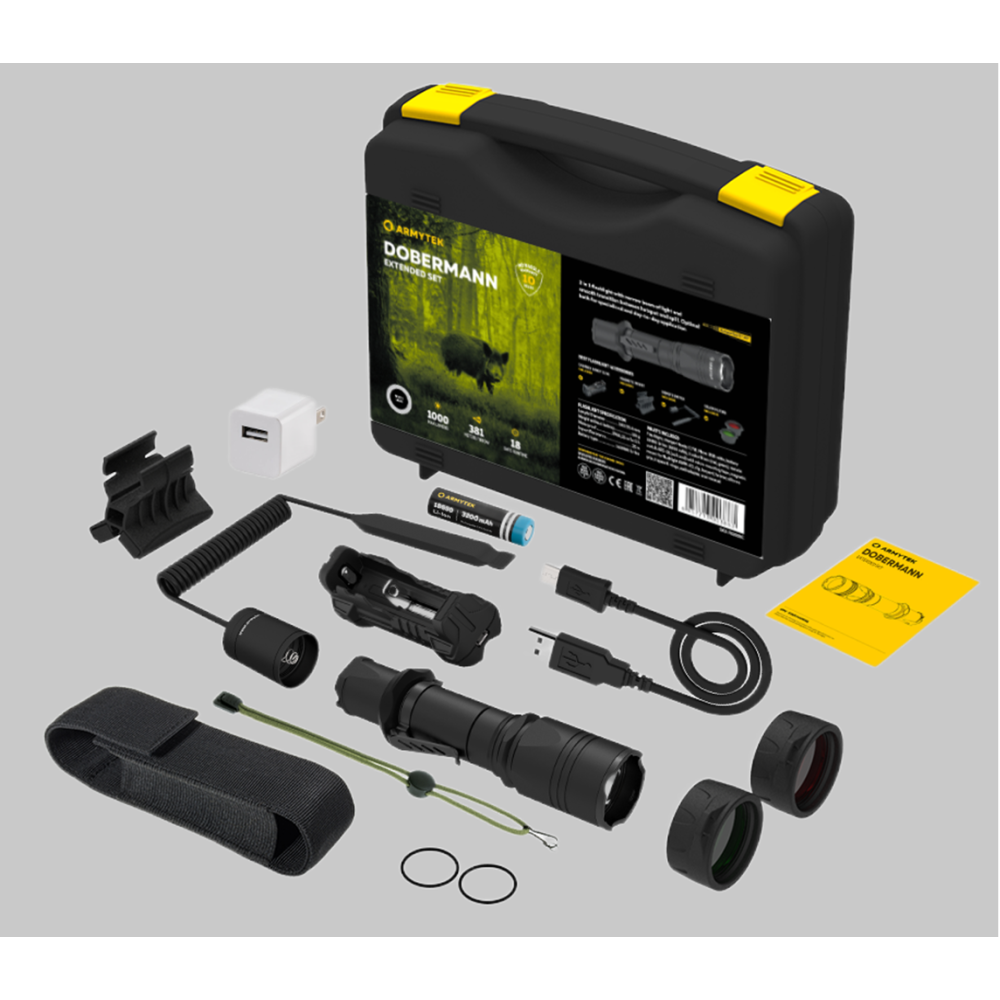Полностью укомплектованный набор для охоты и тактических задач. В пластиковый кейс входят компактный тактический фонарь Dobermann, зарядное устройство и самые популярные аксессуары к нему. Фонарь 2 в 1 Dobermann яркостью в 1000 люмен; Аккумулятор 18650 Li-Ion емкостью 3200 мАч; Зарядное устройство Handy C1 VE с током 2.1А и функцией Powerbank; Магнитное подствольное крепление AWM-03 для установки и снятия одним движением; Выносная кнопка ARS-01 с витым шнуром для удаленного мгновенного включения; Красный и зеленый цветные фильтры.