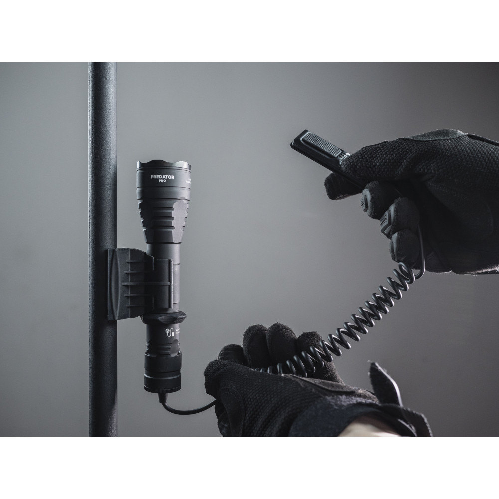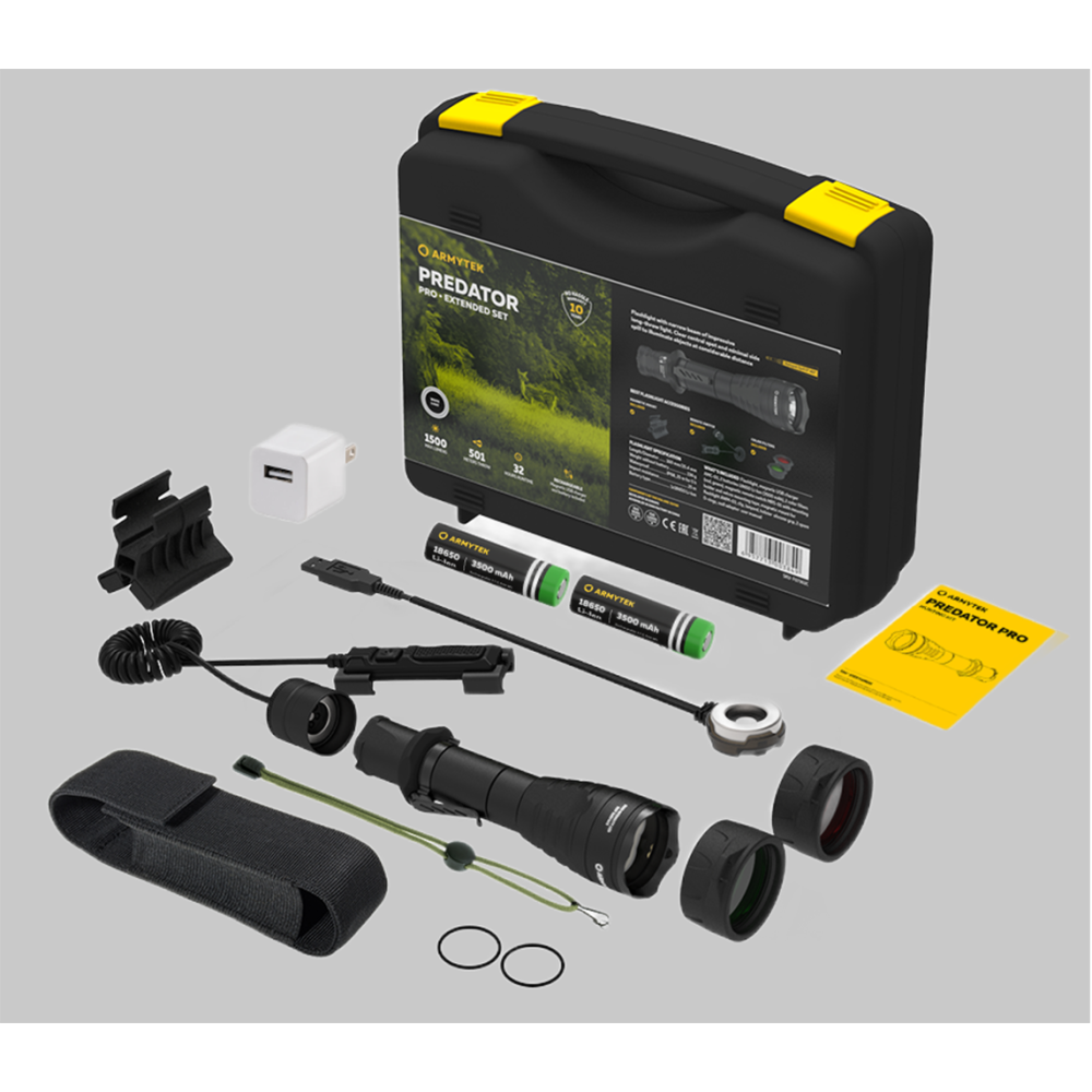 Полностью укомплектованный набор для охоты и тактических задач. В пластиковый кейс входят дальнобойный тактический фонарь Predator Pro с магнитной зарядкой и самые популярные аксессуары к нему. Фонарь Predator Pro яркостью в 1400 люмен; Два аккумулятора 18650 Li-Ion емкостью 3500 мАч; Магнитная зарядка USB; Магнитное подствольное крепление AWM-03 для установки и снятия одним движением; Магнитная выносная кнопка MRS-01 с витым шнуром для моментального (только при нажатой кнопке) или постоянного включения света; Красный и зеленый цветные фильтры.