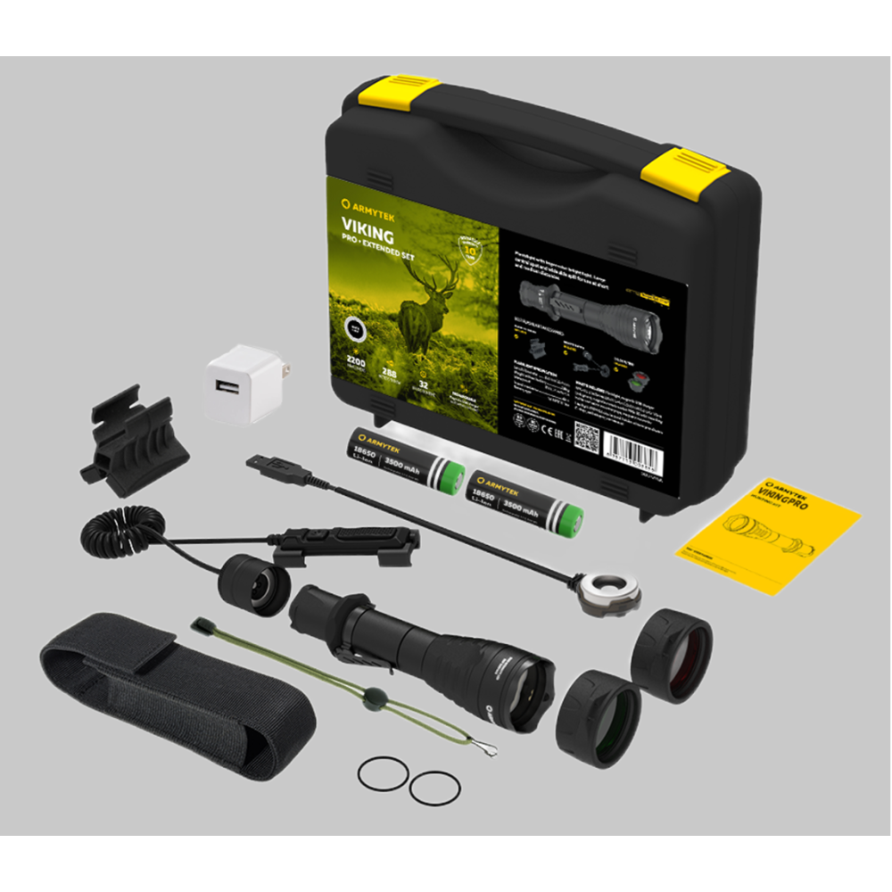 Полностью укомплектованный набор для охоты и тактических задач. В пластиковый кейс входит тактический фонарь Viking Pro с мягким широким светом и магнитной зарядкой, а также самые популярные аксессуары к нему. Фонарь Viking Pro яркостью в 2200 люмен; Два аккумулятора 18650 Li-Ion емкостью 3500 мАч; Магнитная зарядка USB; Магнитное подствольное крепление AWM-03 для установки и снятия одним движением; Магнитная выносная кнопка MRS-01 с витым шнуром для моментального (только при нажатой кнопке) или постоянного включения света; Красный и зеленый цветные фильтры.