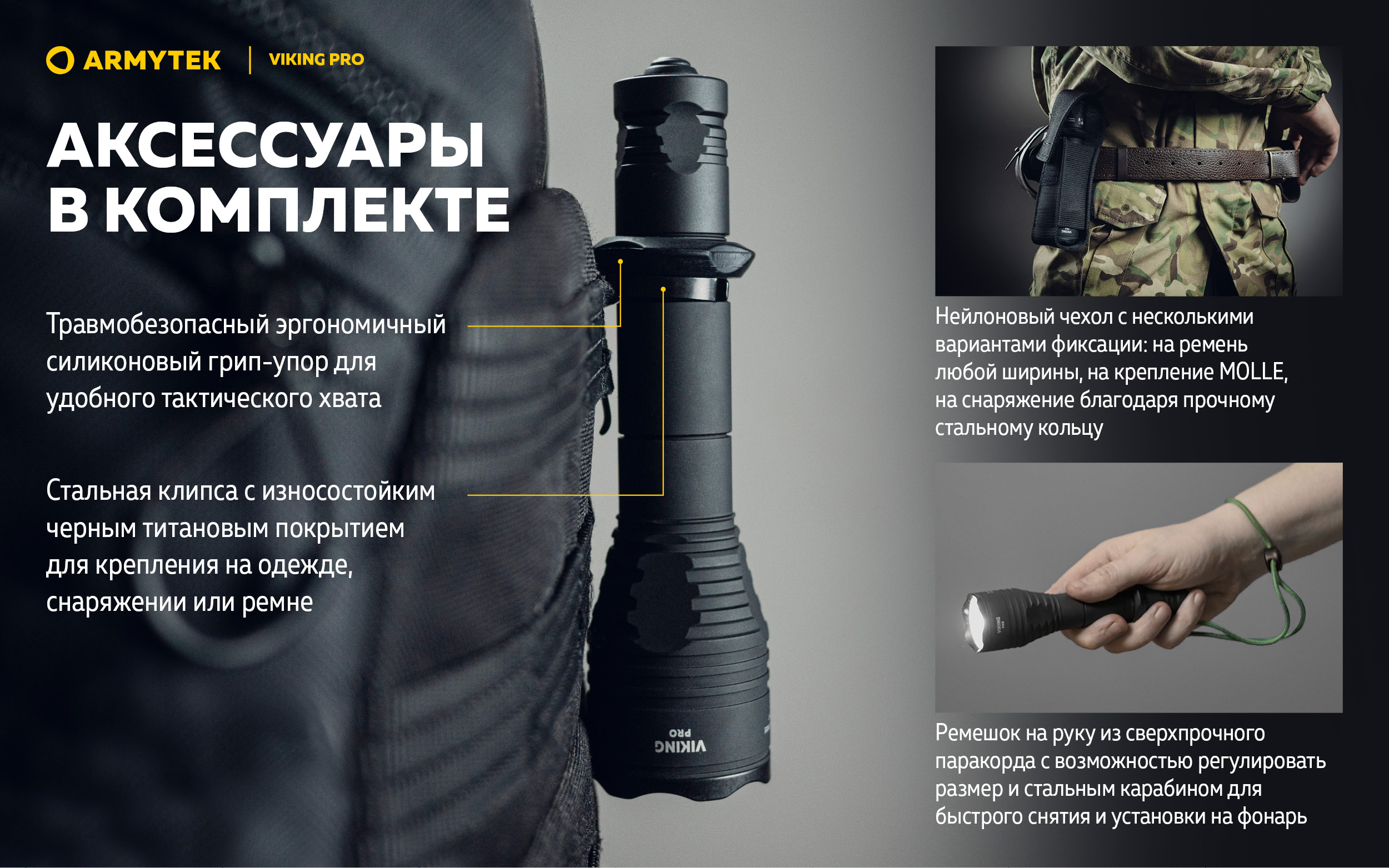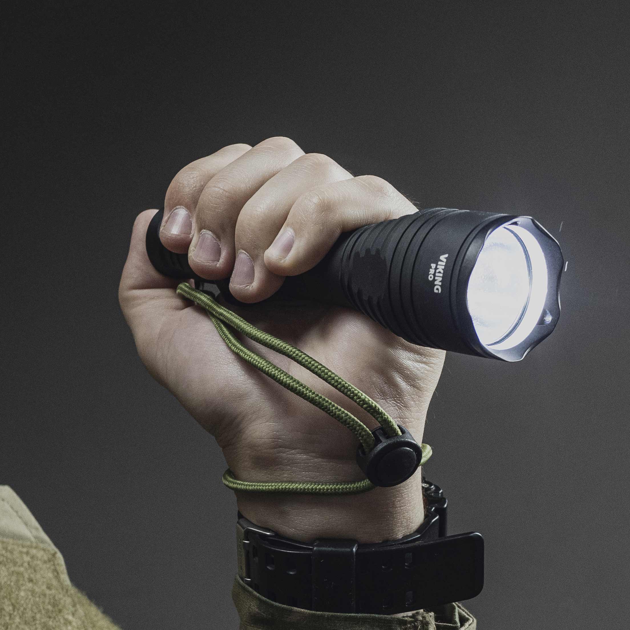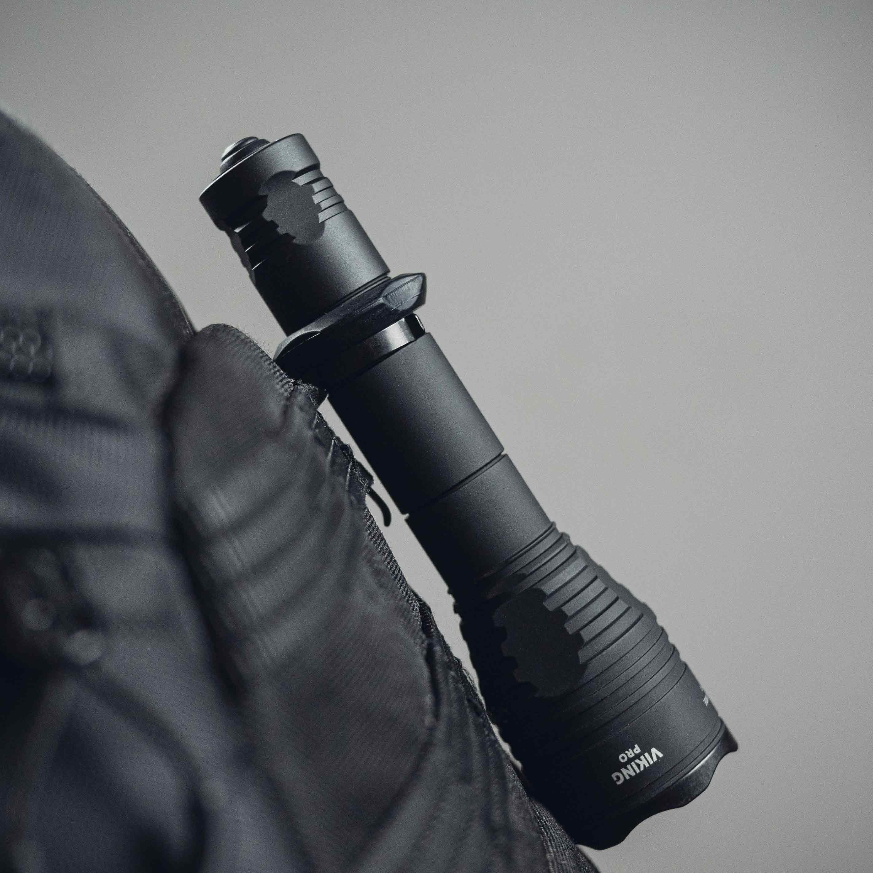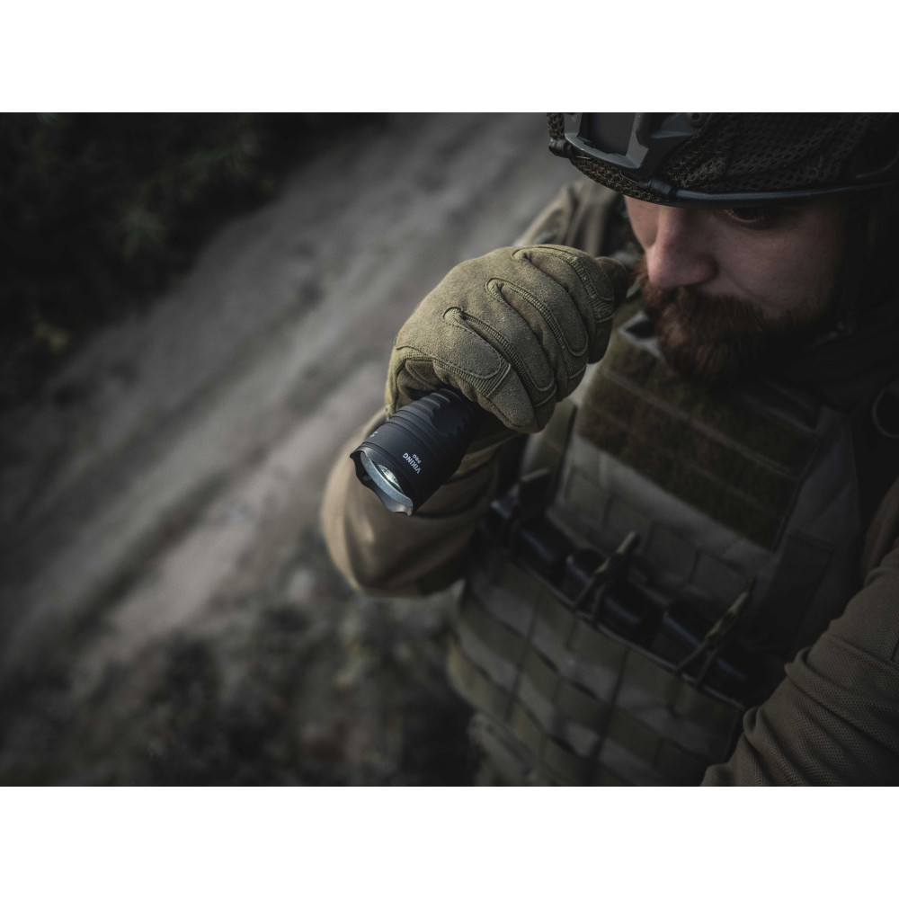 Благодаря силиконовому грип-упору и тактической кнопке в задней крышке Viking Pro удобно использовать одной рукой. Модель совместима с оригинальными цветными фильтрами и выносными кнопками, а также с любыми универсальными подствольными креплениями.
