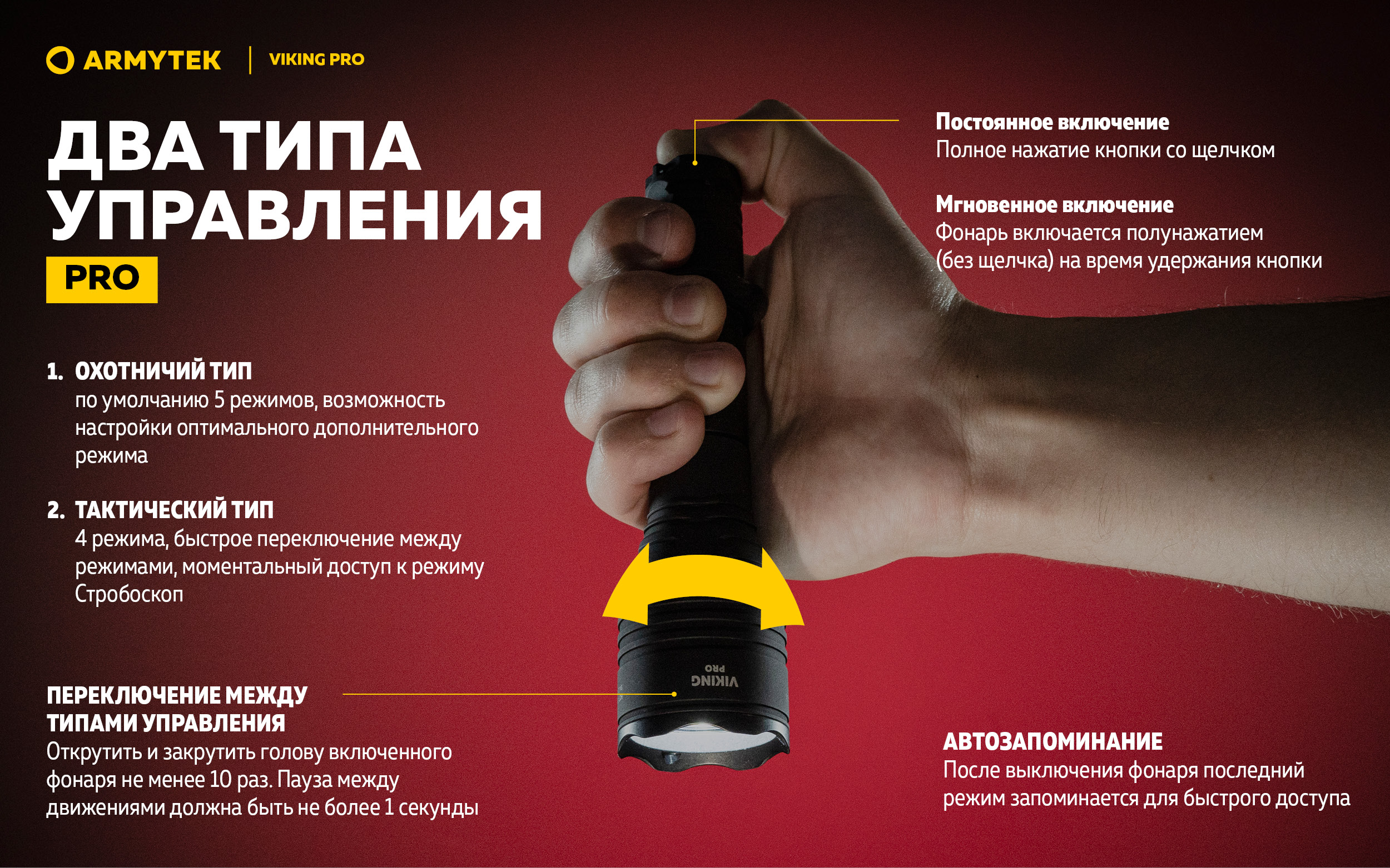 - Pro Два типа управления: охотничий и тактический. Тактический тип для быстрого доступа к режиму максимальной яркости и Стробоскопу.