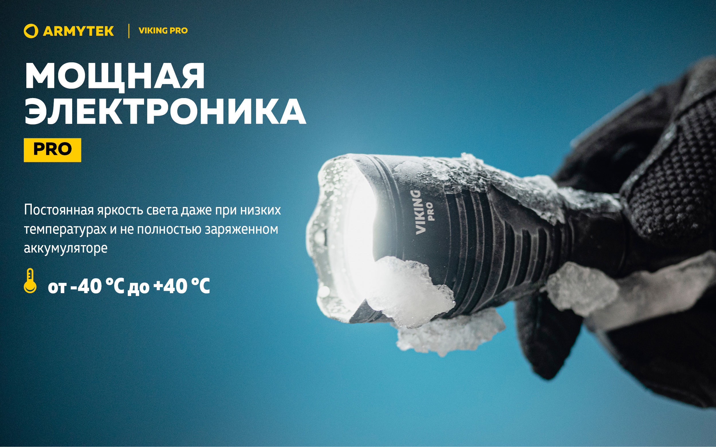 - Pro Мощная электроника обеспечивает постоянную яркость света даже при температуре -40 °C и не полностью заряженном аккумуляторе.