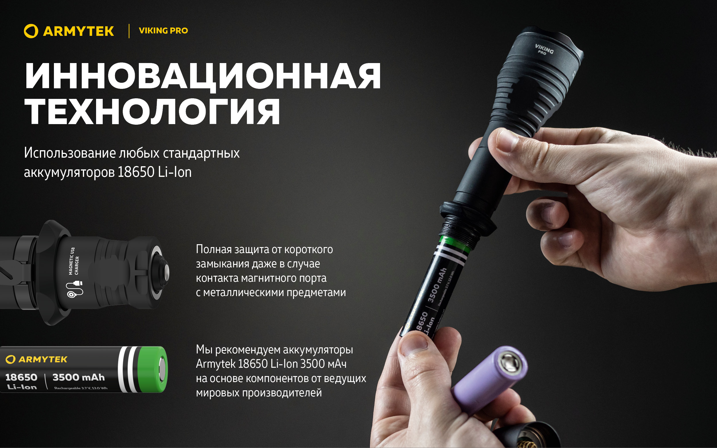Быстрая магнитная зарядка: комплектный аккумулятор 18650 Li-Ion 3500 мАч заряжается за 3 ч 40 мин.