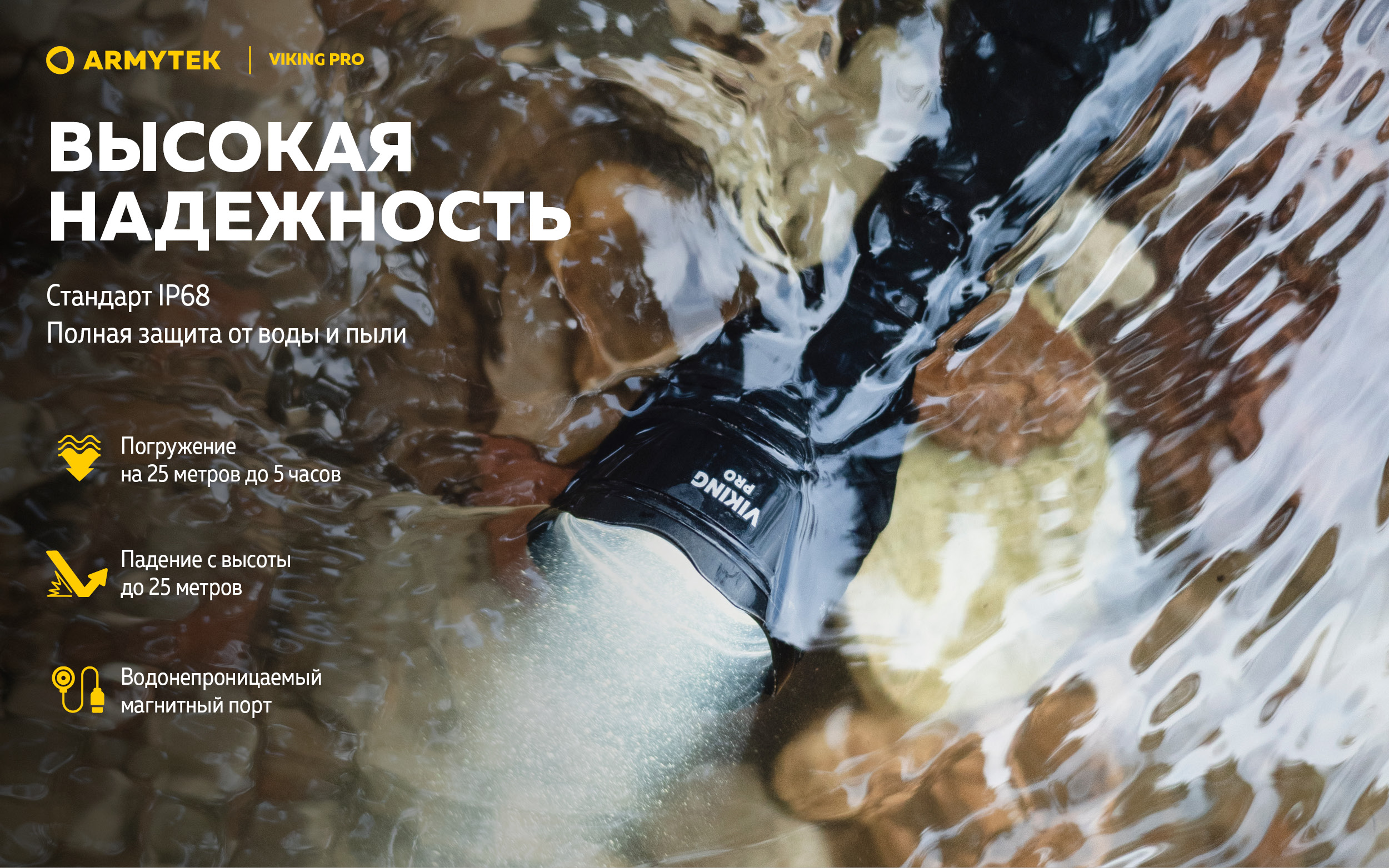 - Полная защита от воды, грязи и пыли по стандарту IP68 — фонарь продолжает работать даже на глубине 25 метров до 5 часов. Выдерживает падение с 10 этажа.