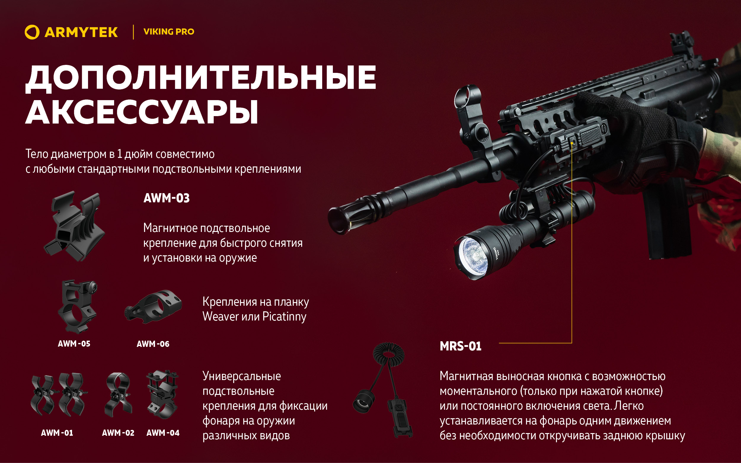 - Стандартное тело диаметром в 1 дюйм совместимо с любыми аксессуарами, в том числе с оригинальной магнитной выносной кнопкой и магнитным подствольным креплением для быстрого снятия и установки на оружие.