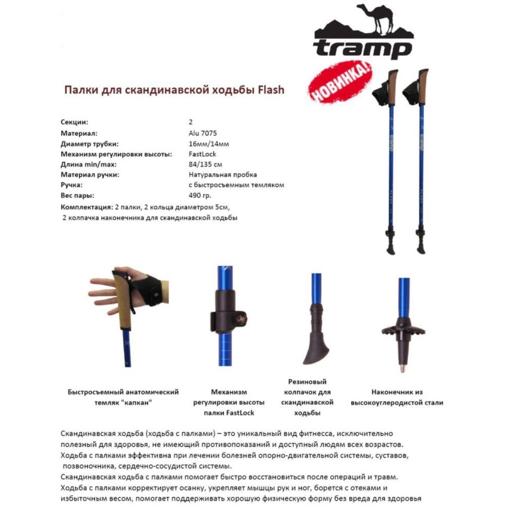 Короткое описание Двухсекционные складные палки для скандинавской хотьбы Tramp Flash - улучшенная версия палок Tramp Fitnes.
