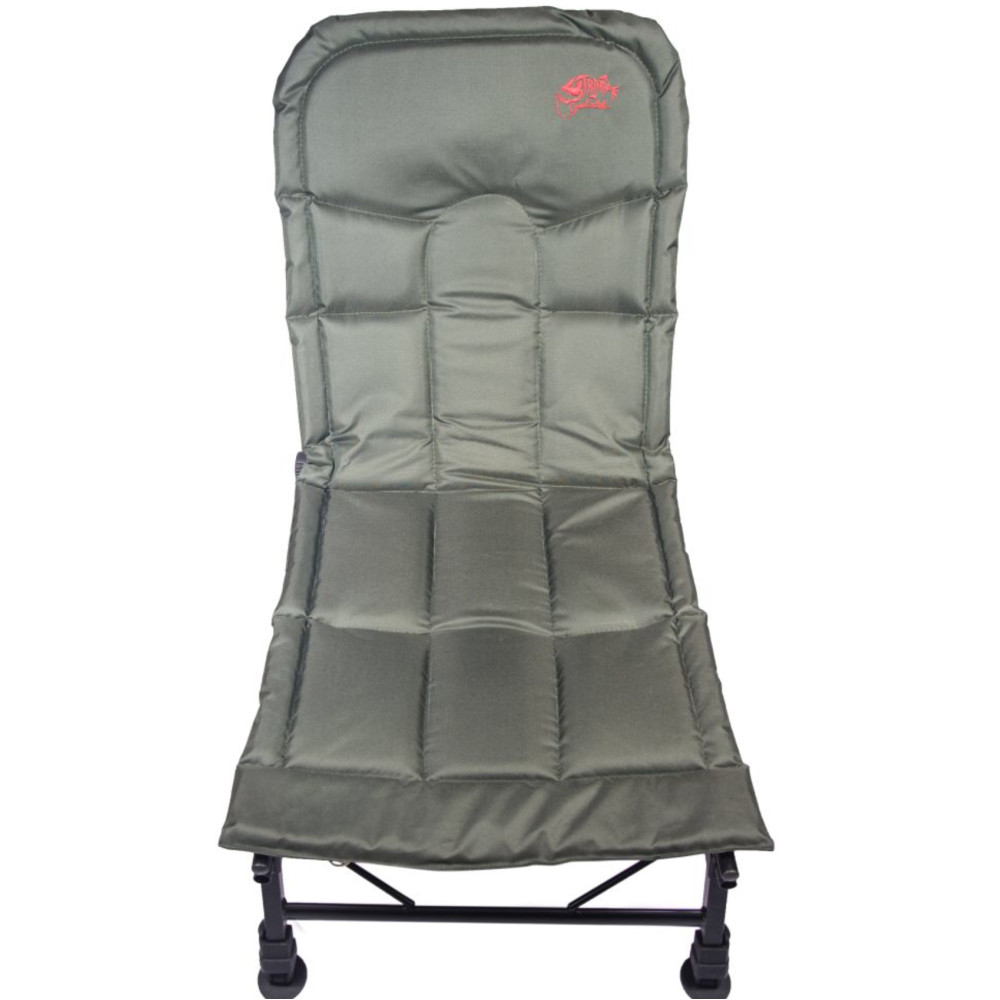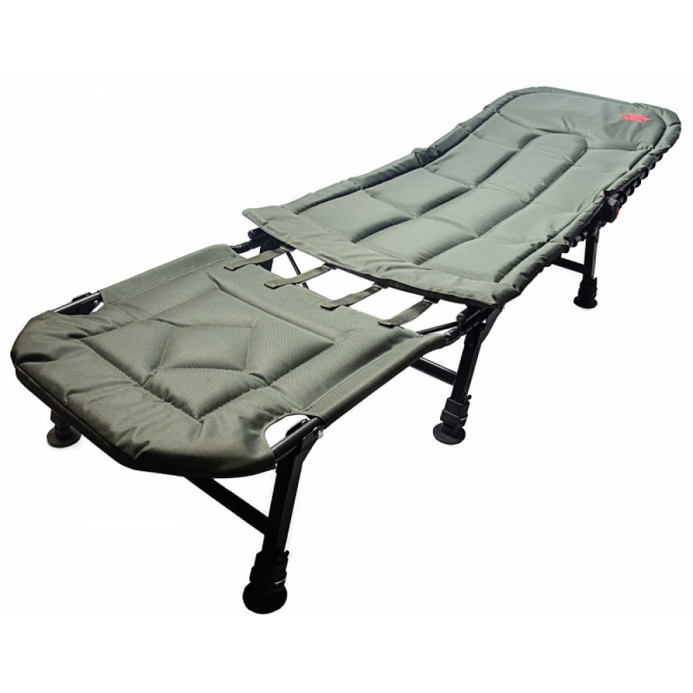 Карповое кресло-трансформер Tramp Lounge (TRF-055) - лучшее решение для тех кто не может выбрать, что же приобрести: кресло или раскладушку? Вы можете весь день ловить рыбу из комфортного кресла с широкой спинкой, а перед сном легко подсоединить к нему дополнительный модуль и с комфортом провести ночь на большой удобной раскладушке. Модель собрана на традиционно прочной стальной раме выдерживающей вес до 120 кг. Угол наклона широкой и высокой спинки можно просто отрегулировать.Кресло Трамп Лаунж и дополнительный модуль оборудованы телескопическими ножками, благодаря каким кресло легко можно установить на практически любой неровной поверхности. На ножках продуманы широкие наконечники предотвращающие вдавливание ножек в мягкий грунт и погружение в песок при нагрузке.