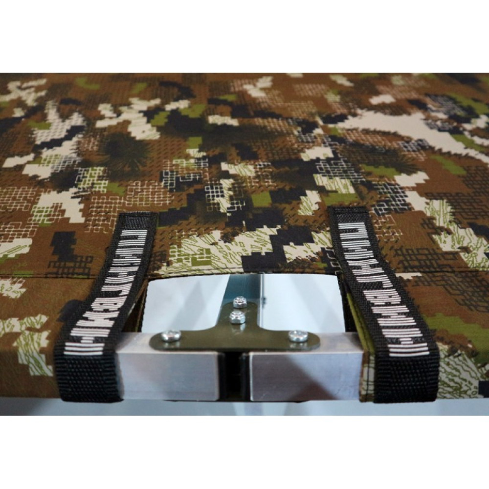 В качестве дополнения, в комплекте идет многофункциональная защитная накладка из ПВХ плёнки на липе, позволяющая положить ноги в сапогах на раскладушку, не боясь запачкать и промочить ткань, на ней удобно делать прикормку, разложить насадку, бросить влажное полотенце. Крепление на липе или с одной стороны раскладушки, или с другой, для удобства правшей-левшей.