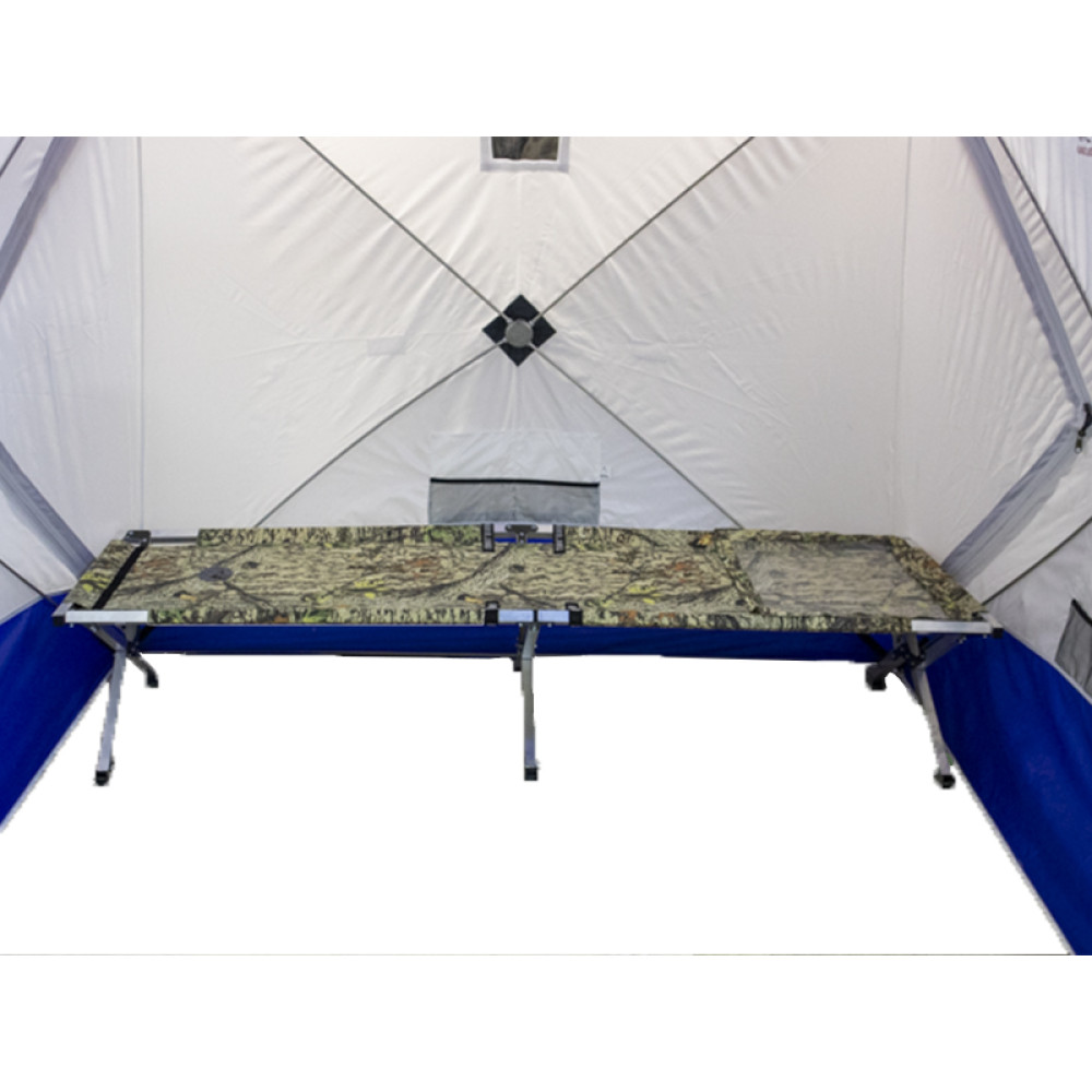 В качестве дополнения, в комплекте идет многофункциональная защитная накладка из ПВХ плёнки на липе, позволяющая положить ноги в сапогах на раскладушку, не боясь запачкать и промочить ткань, на ней удобно делать прикормку, разложить насадку, бросить влажное полотенце. Крепление на липе или с одной стороны раскладушки, или с другой, для удобства правшей-левшей.