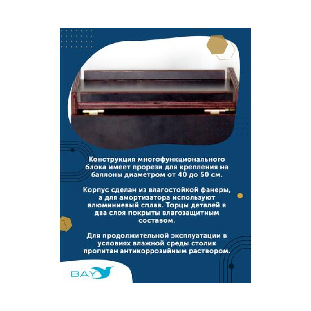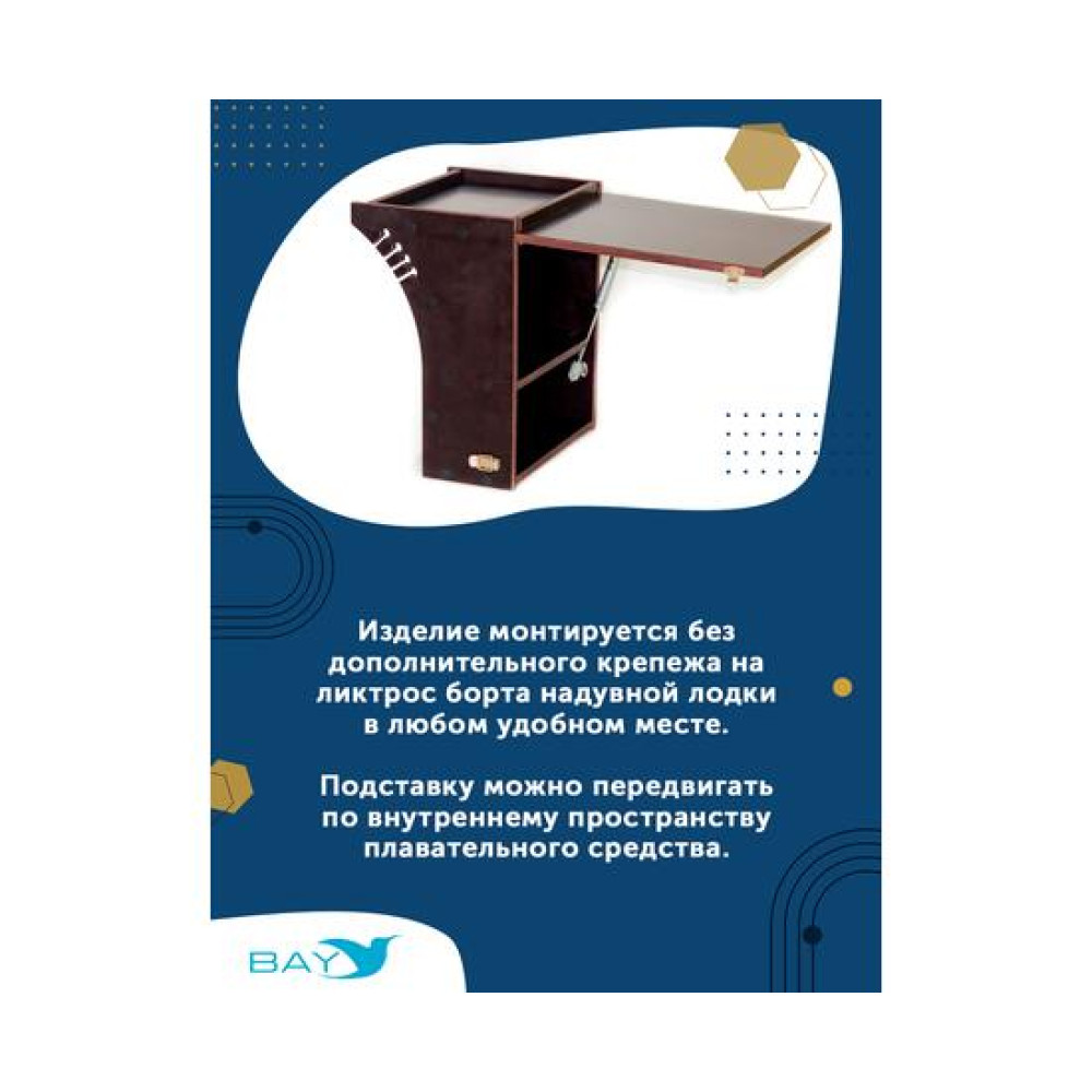 Быстро монтируется на ликтрос борта надувной лодки, в удобном для Вас месте, без использования дополнительного крепежа.Имеется 4 прорези для крепления на разные баллоны (D от 40 до 50 см).Модель оснащена одним амортизатором и бортиками по периметру столика Предусмотрена ниша под АКБ 7, 9 или 12 Ач