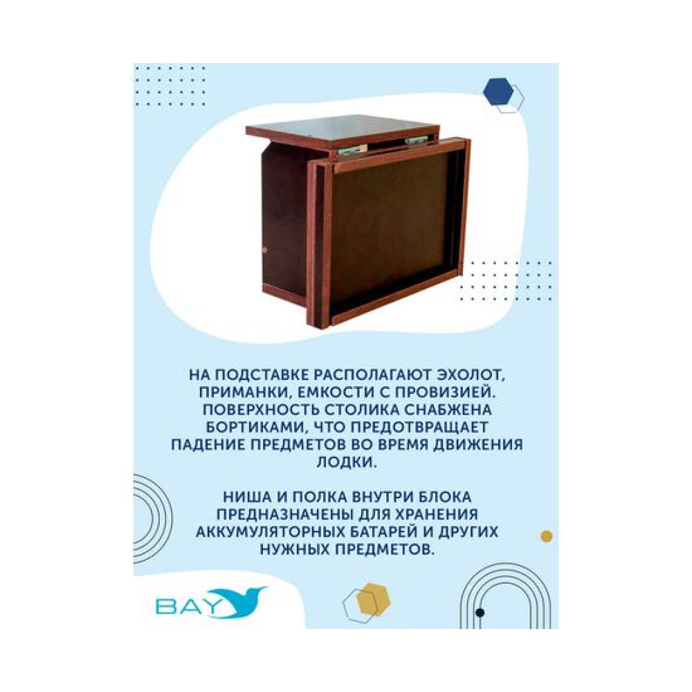 Предусмотрена ниша для АКБ, состоящая из двух отсеков (может закрываться дверцей-столиком) и площадка для монитора эхолота