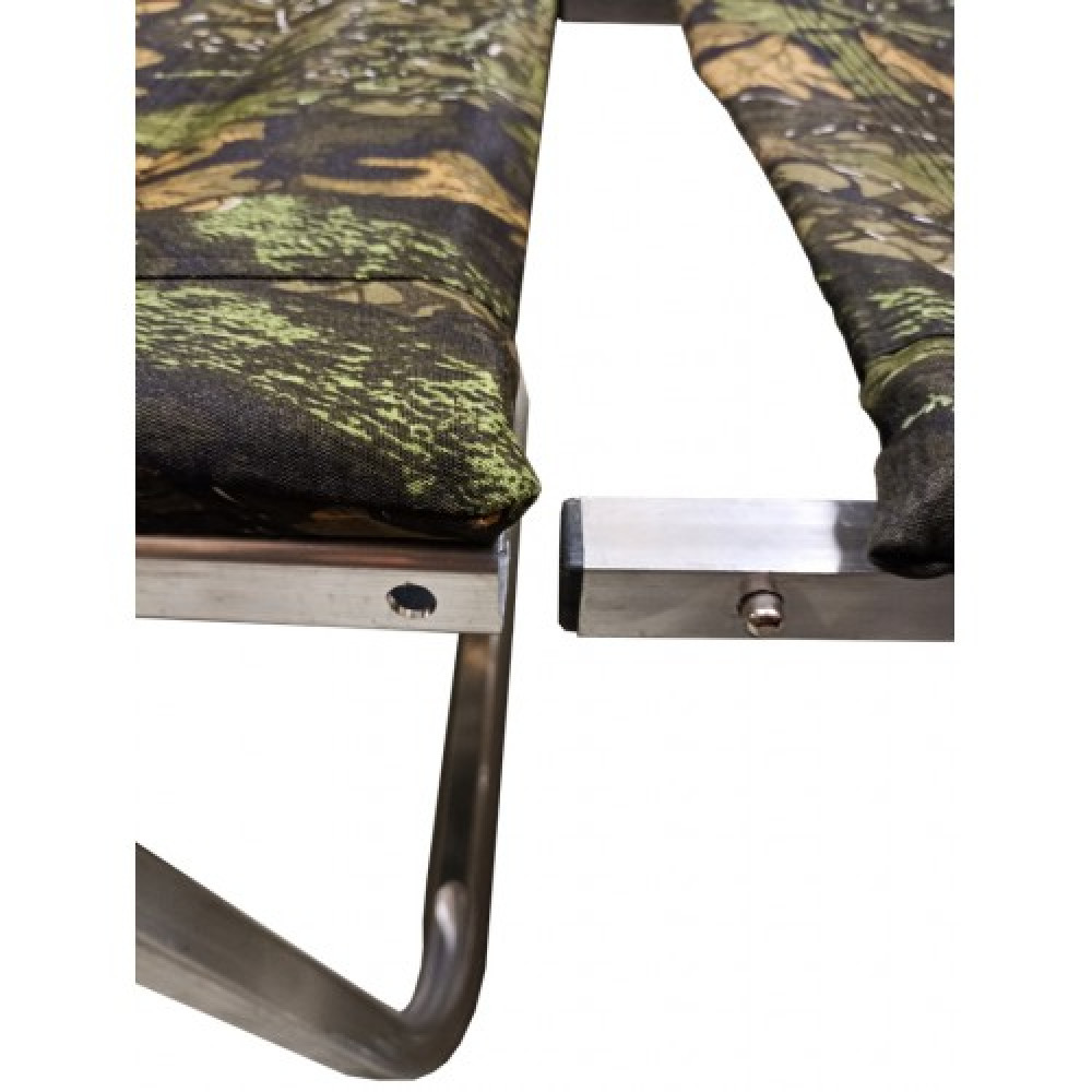 Данная модель отличается высокой жесткостью, поскольку изготовлена из квадратного алюминиевого профиля со скруглёнными краями, а съёмная подставка для ног на кнопочном фиксаторе подарит дополнительный комфорт вашему отдыху на природе.