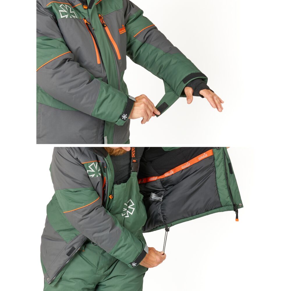 Свободный крой костюма не сковывает движений, благодаря чему в нём комфортно передвигаться даже по глубокому снегу. Манжеты рукавов регулируются хлястиком с липучкой. Есть внутренняя эластичная манжета-полуперчатка, дополнительно защищающая от проникновения ветра внутрь куртки. Высокая функциональность дополняется надежностью двухзамковых молний YKK, укрытых ветрозащитной планкой на липучках.