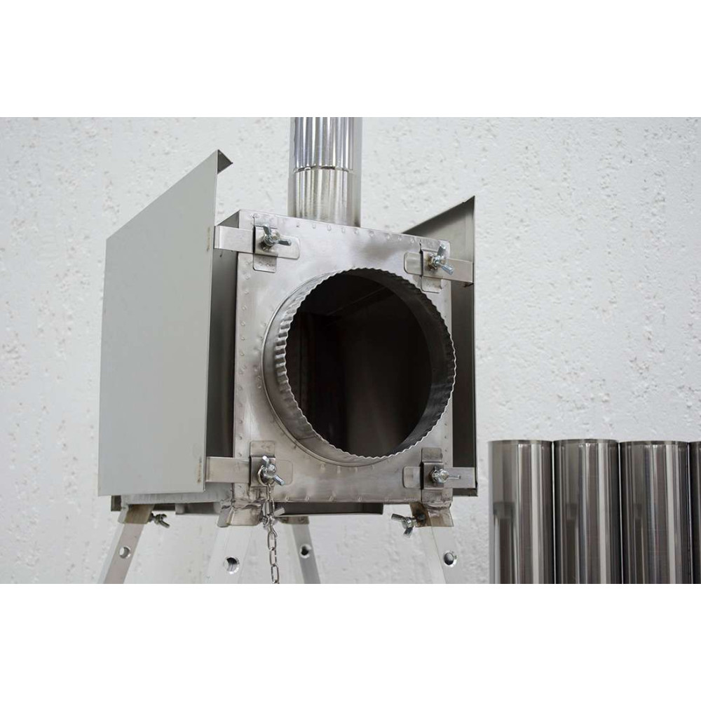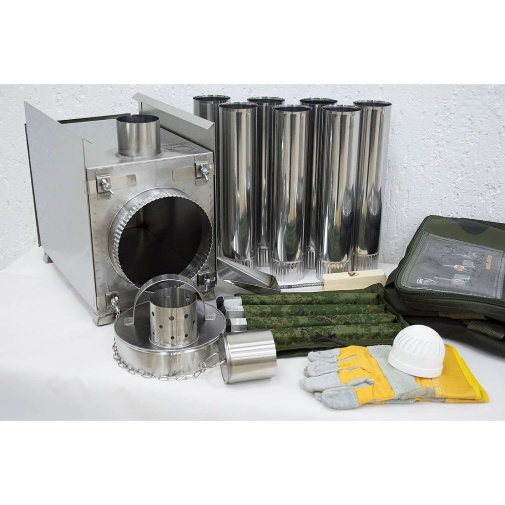 В верхней части топочной камеры расположена пластина - искрогаситель (искроуловитель), который увеличивает КПД печки при использовании в зимней палатке. Искрогаситель образует дополнительную камеру сгорания, которая не позволяет теплу покидать топочную камеру напрямую. Также за счет наличия искрогасителя продолжительность горения походной мини печи на одной закладке дров достигает 4-5 часов.