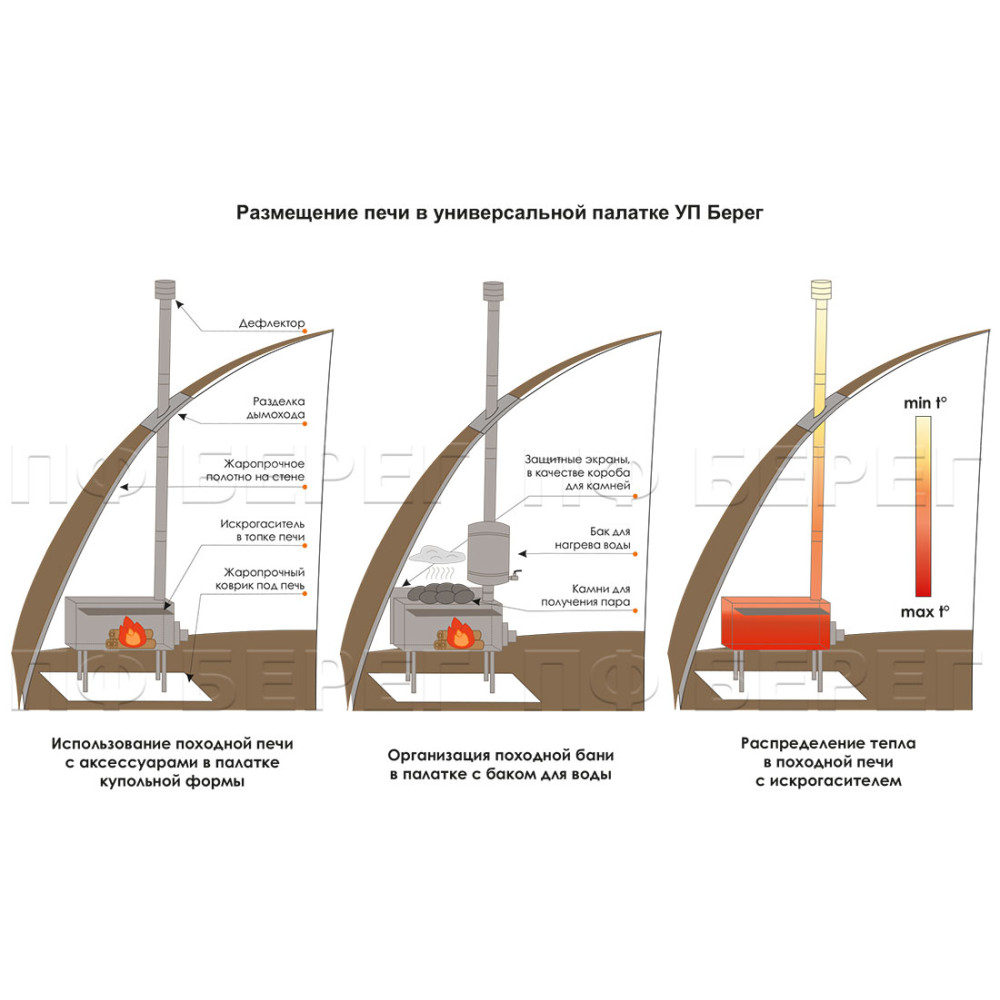 Отражающие экраны играют важную роль в безопасности применения походной мини печи длительного горения. Печь мини, оборудованная нижним и боковыми отражающими экранами, обеспечивает максимальный уровень пожарной безопасности, защищает тент, дно палатки, грунт и личные вещи от оплавления и возгорания. Отражающие экраны обеспечивают конвекционные потоки вдоль корпуса, способствуя быстрому нагреву воздуха.