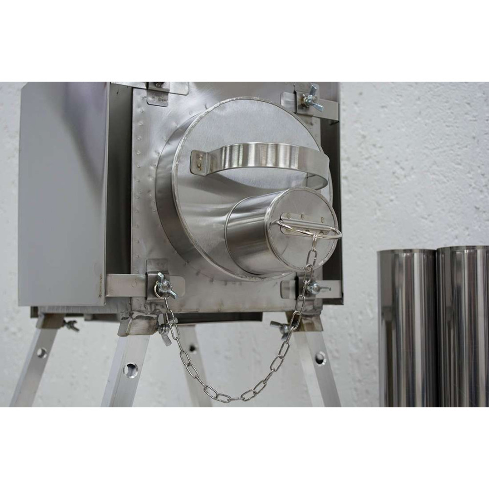 В передней части мини печки Экономка расположена топочная дверца со «стаканом» для регулировки подачи кислорода. Топочная дверца имеет съемную конструкцию без стационарных креплений, таким образом, вероятность поломки сведена к минимуму.