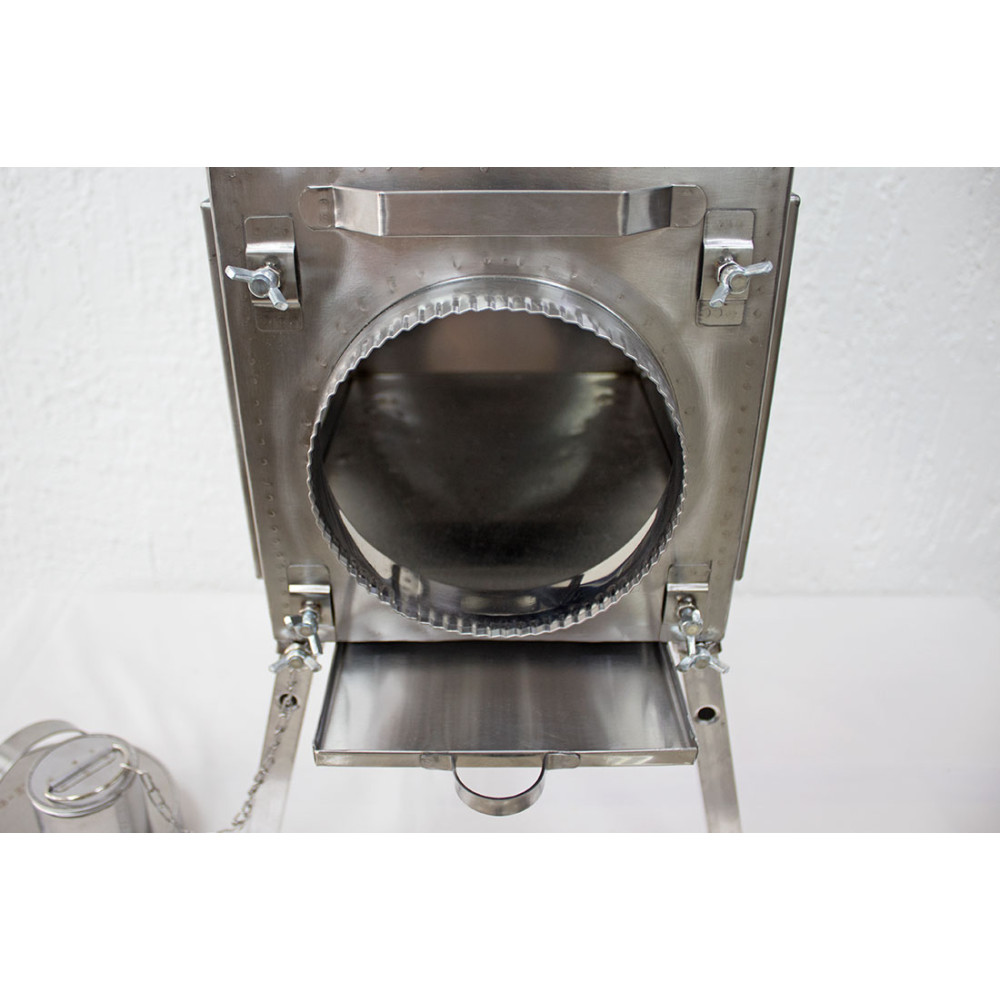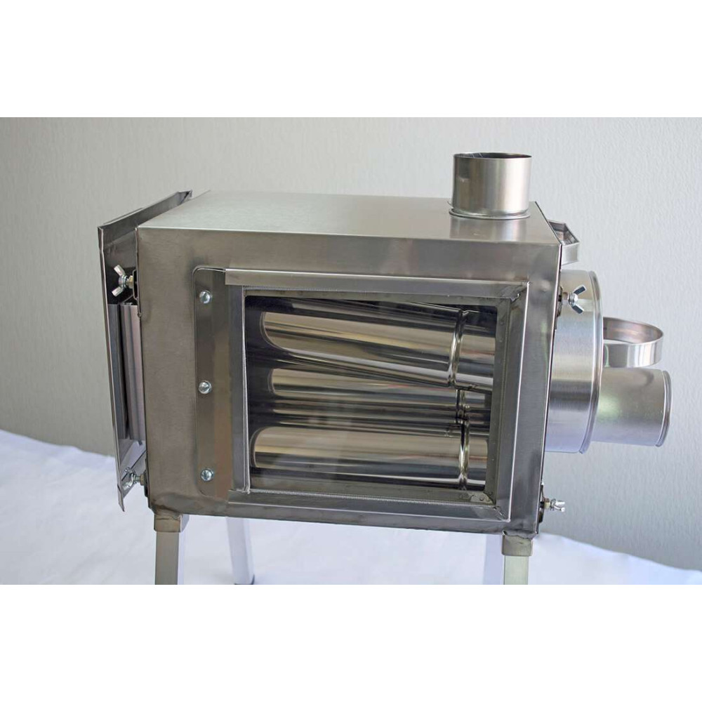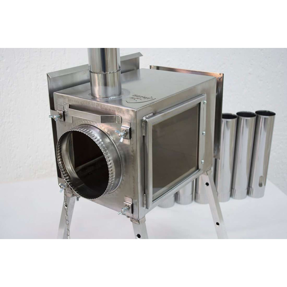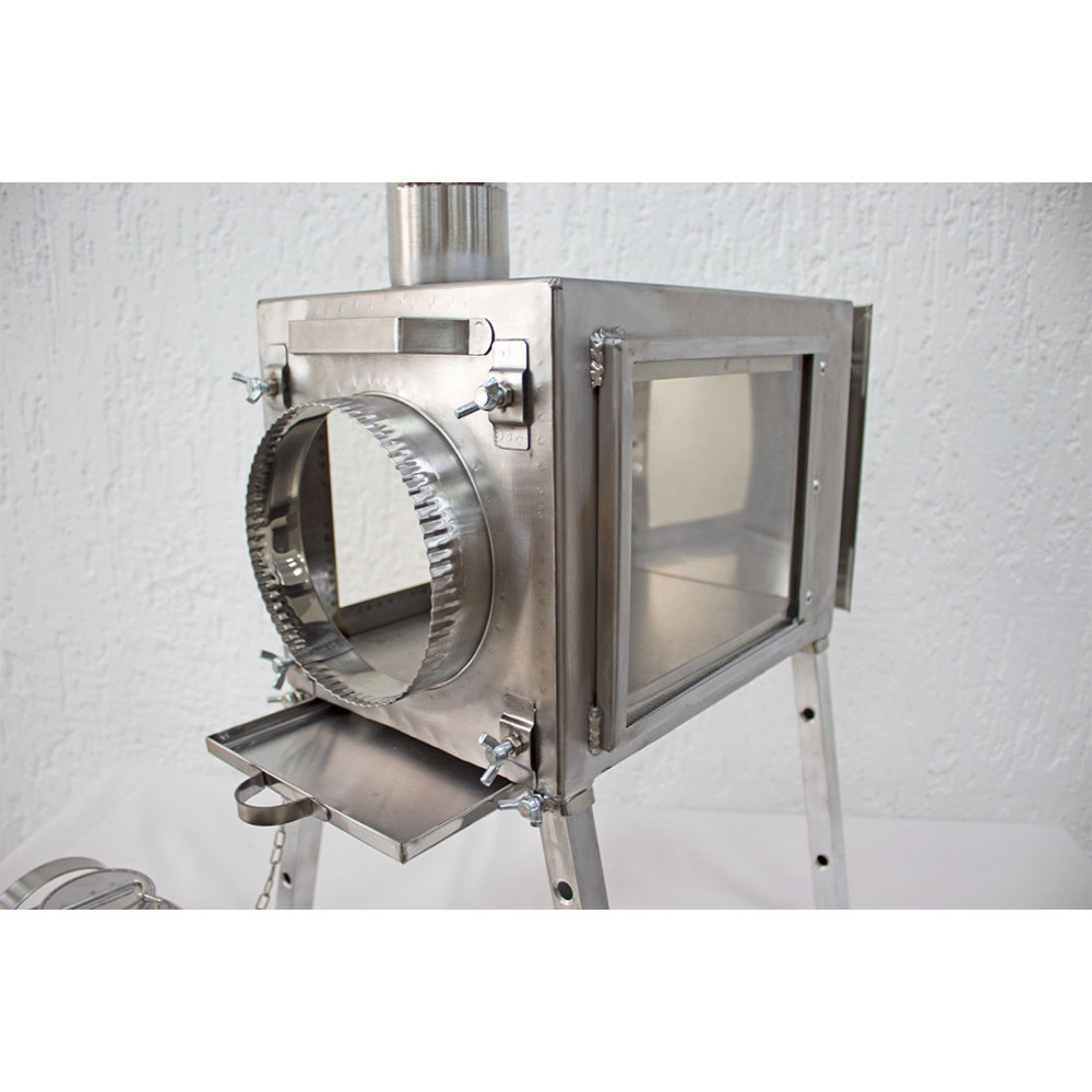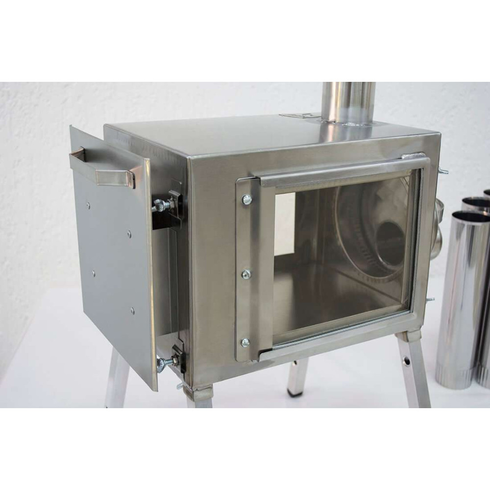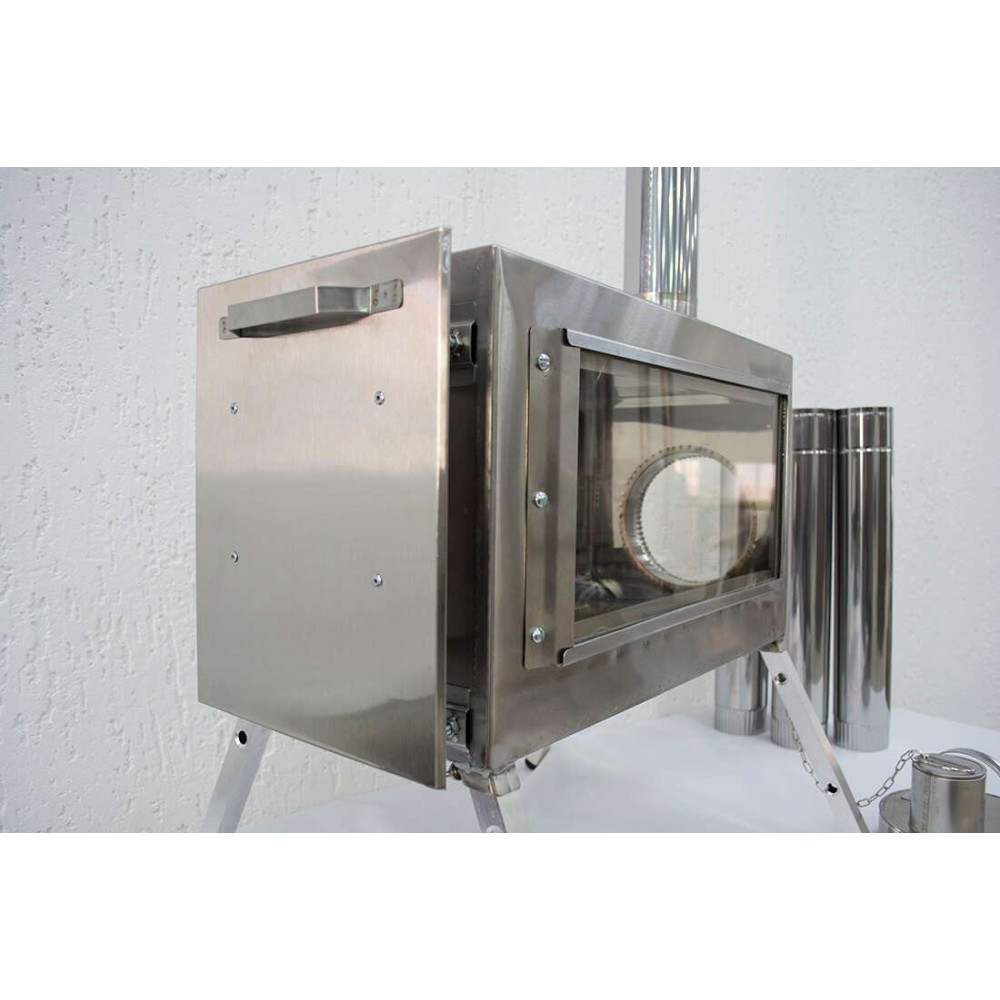 Печь туристическая Берег Камин Малая изготовлена из комбинированных материалов. Корпус печи выполнен из нержавеющей стали AISI 430 толщиной 1 мм. Термостойкие стекла имеют толщину 4 мм и произведены в Германии. Место соединения металлической и стеклокерамической частей снабжено термостойким уплотнителем. Уплотнитель исключает утечки дыма или повреждение стекла при эксплуатации. Герметичность печи обеспечена дополнительной проваркой аргоном.