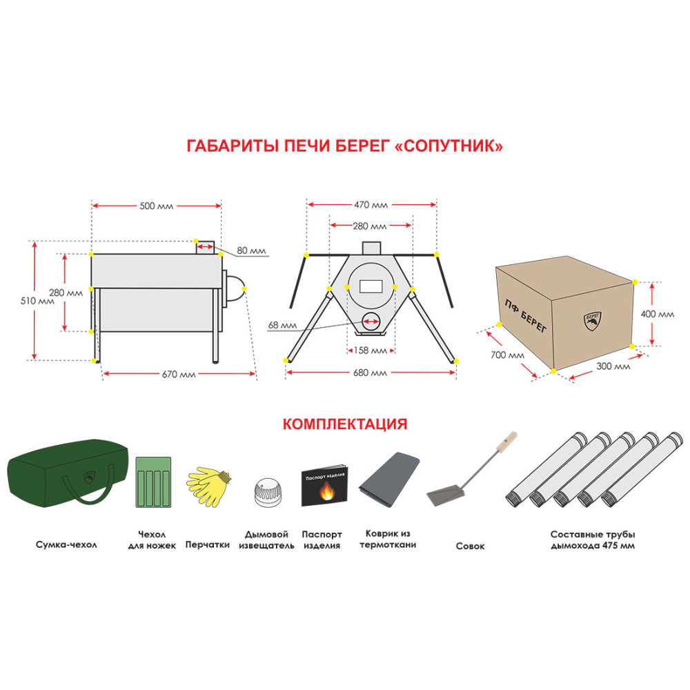 Сопутник комплектуется трубами дымохода, съемными ножками с отдельным чехлом, перчатками, дымовым извещателем, совком и усиленной сумкой-чехлом для транспортировки.