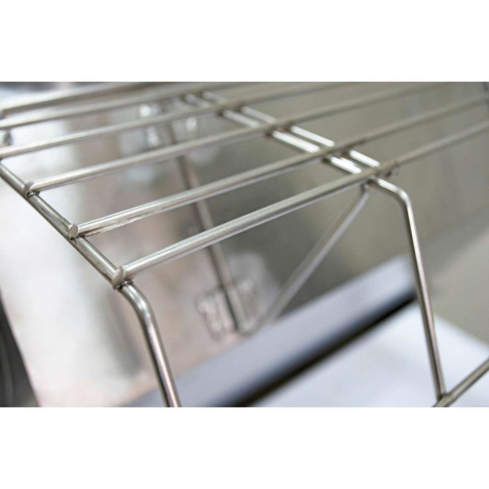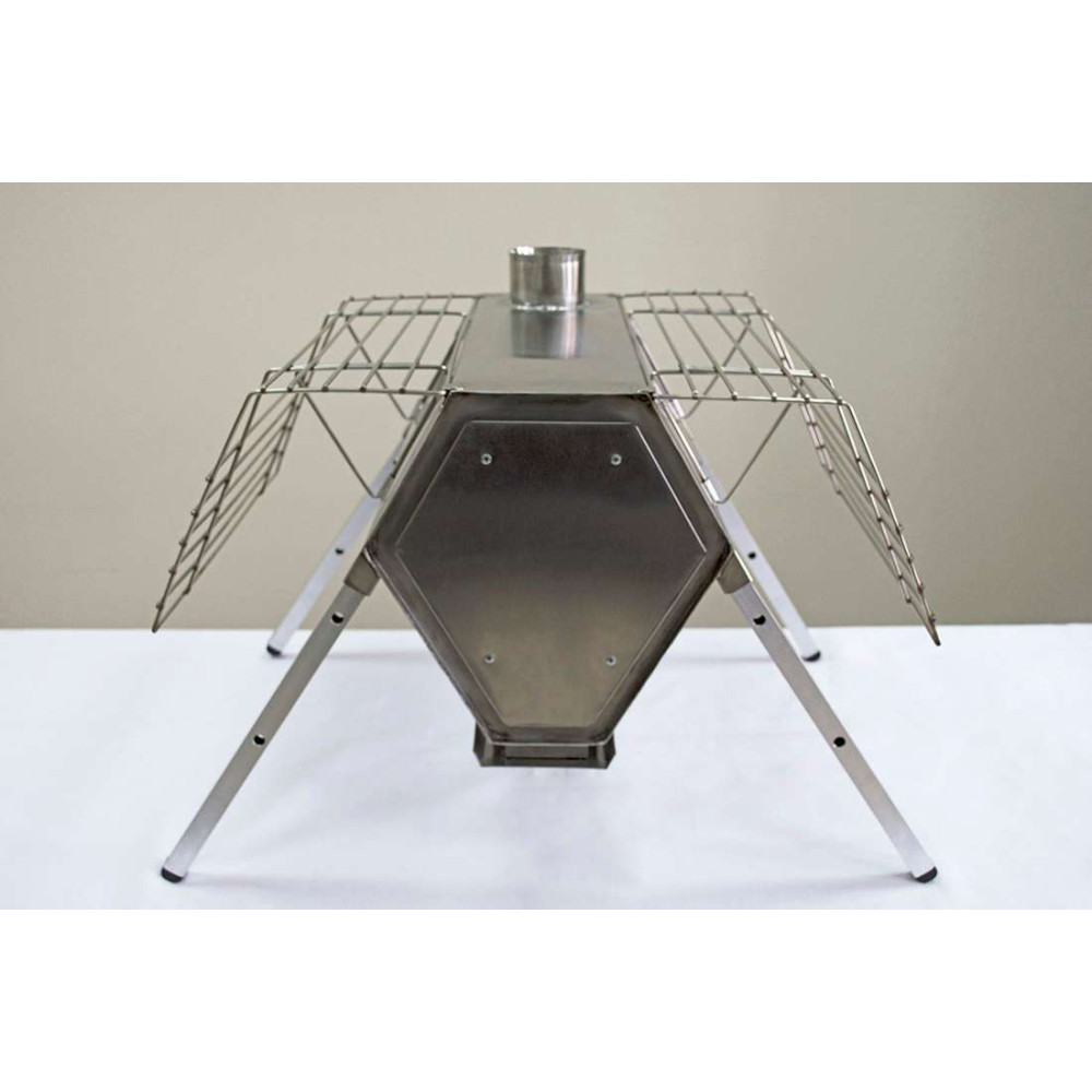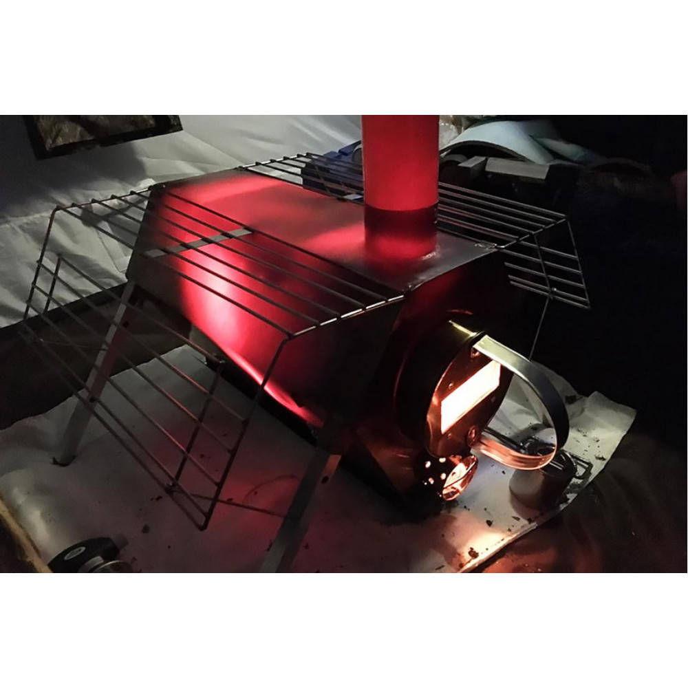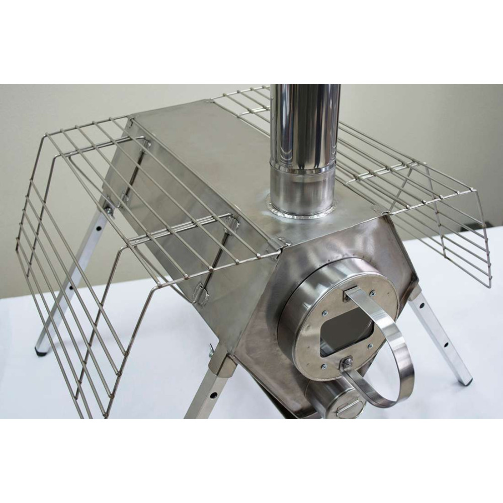 - Две встроенные решетки устанавливаются на подпорки и расположены с боковых сторон. Горизонтальная поверхность решеток увеличивает площадь варочной поверхности и используется для разогрева пищи, хранения котелков или чайников. Наклонная часть решеток выполняет защитную функцию, предупреждает соприкосновение одежды с раскаленной поверхностью печи или выступает сушкой для небольших элементов одежды, снаряжения. В собранном виде решетки крепятся к нижнему защитному экрану. Такое решение сокращает габариты, облегчит хранение и транспортировку походной печи.