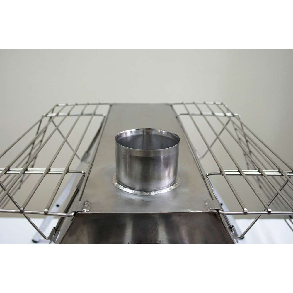 - Стакан для регулировки подачи кислорода находится в нижней части короба походной печи. Стакан используется для регулирования подачи кислорода, который определяет время и интенсивность горения дров. Поддувало комплектуется съемной мелкоячеистой металлической сеткой, которая предотвращает образование и вылет искр из топки.