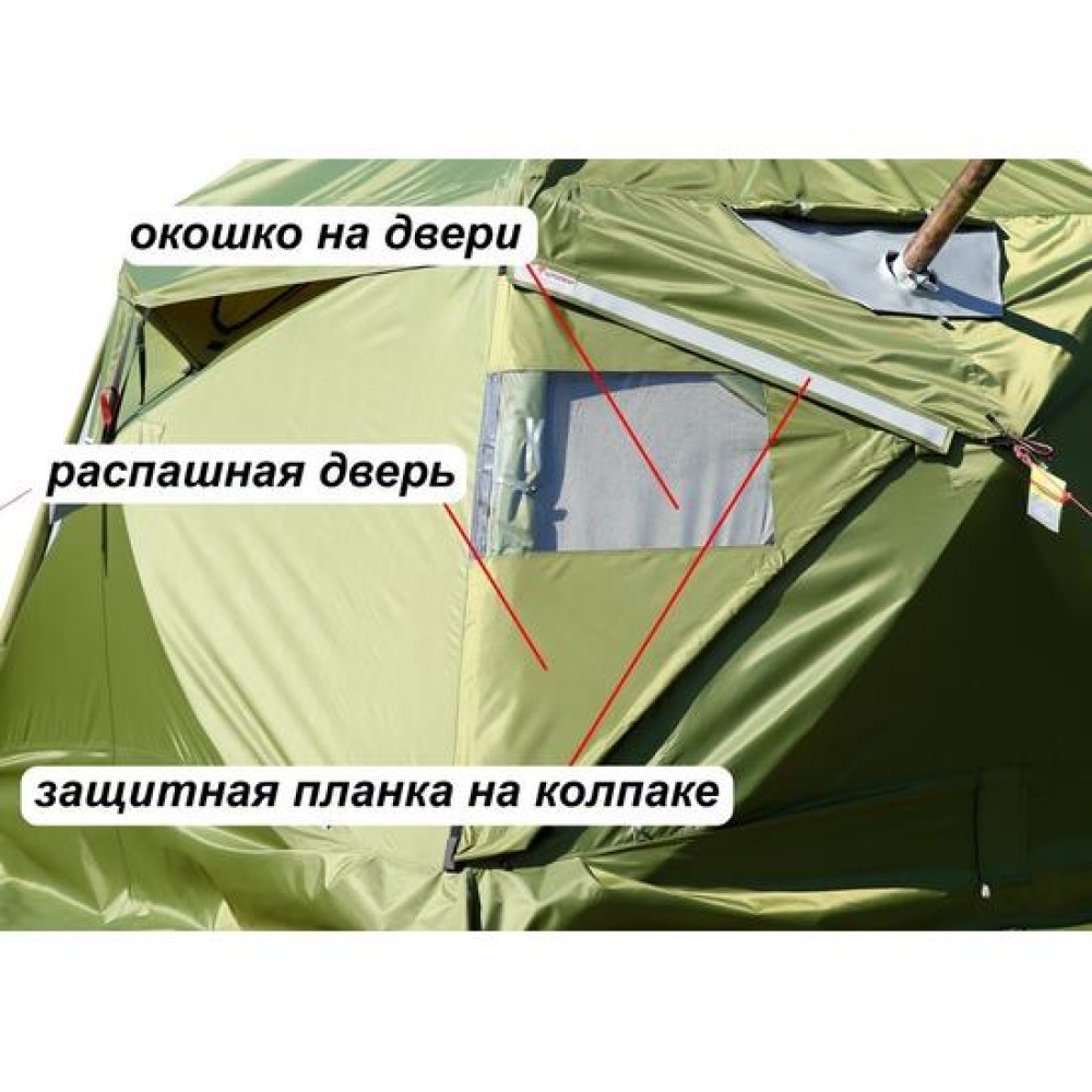 Наличие распашной двери значительно повышает комфортность эксплуатации, так как вход (выход) в палатку может осуществляться без закрытия дверной молнии и, при этом, с сохранением тепла в жилом помещении