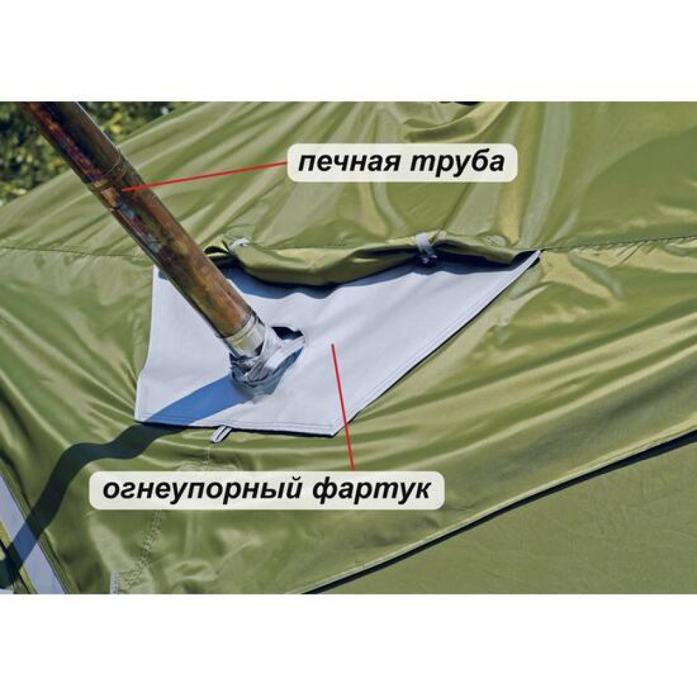 При эксплуатации палатки с дровяной печью, вытяжная труба выводится через полностью открытый клапан на колпаке, при этом, в сам проем этого клапана устанавливается специальный огнеупорный фартук, обеспечивающий защиту зоны вывода трубы от осадков