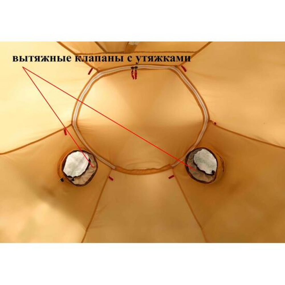 Верхняя система вентиляции обеспечивается вытяжными клапанами, которые находятся в потолочной части тента