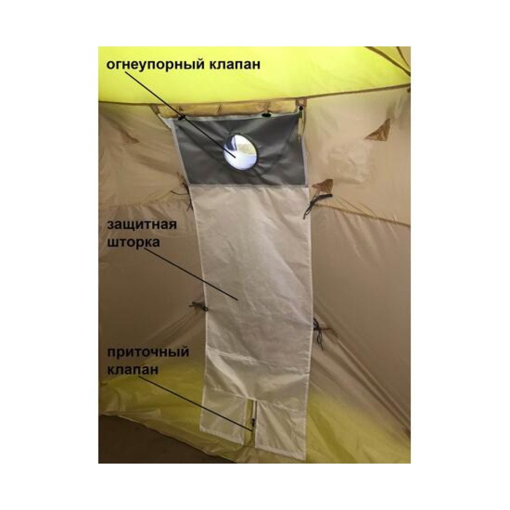 Защитная шторка фиксируется изнутри на стенке тента с воздушным зазором, которая обеспечивает тепловую защиту для ткани внутреннего тента от нагрева отопительной печью