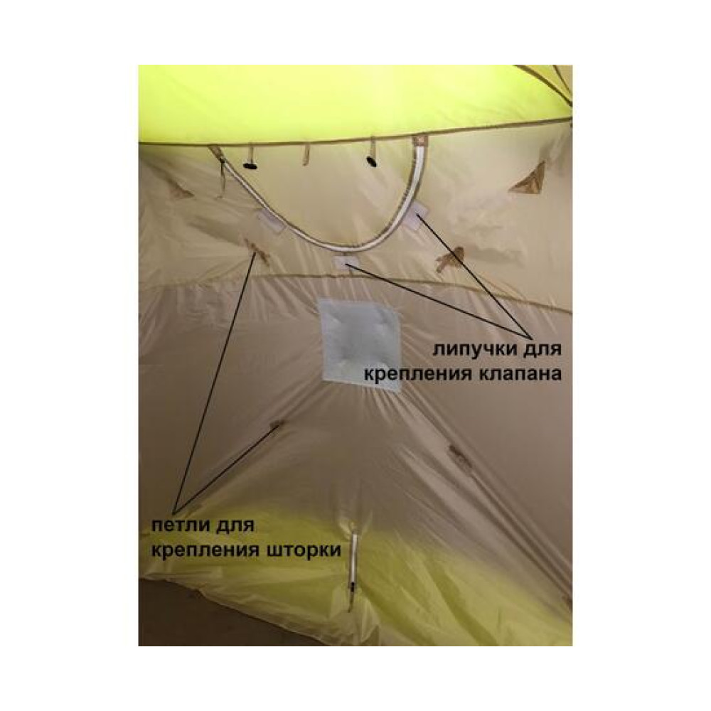 В одном из оконных проемов внутреннего тента встроена система крепления огнеупорного клапана с защитной шторкой (опция, приобретается отдельно), предназначенного для фиксации и вывода вытяжной трубы дровяной печи и прочих обогревательных приборов