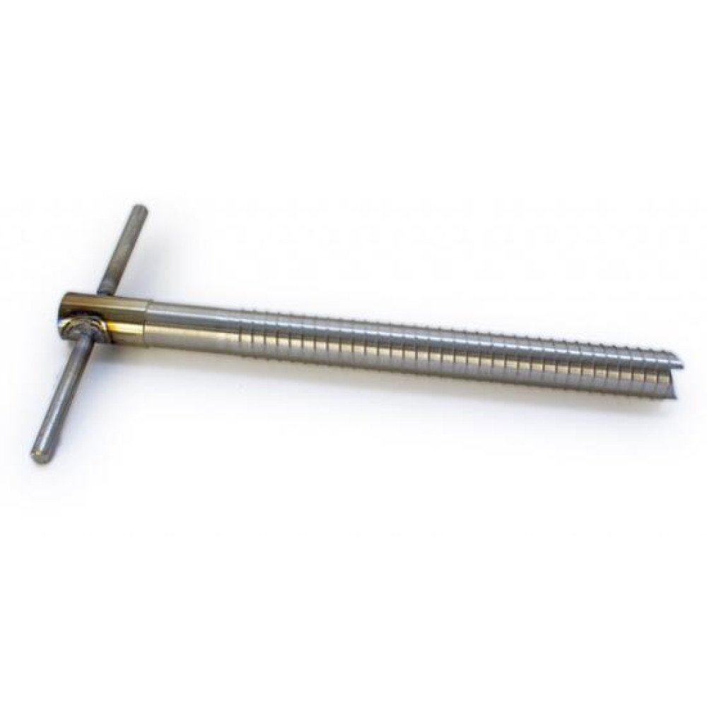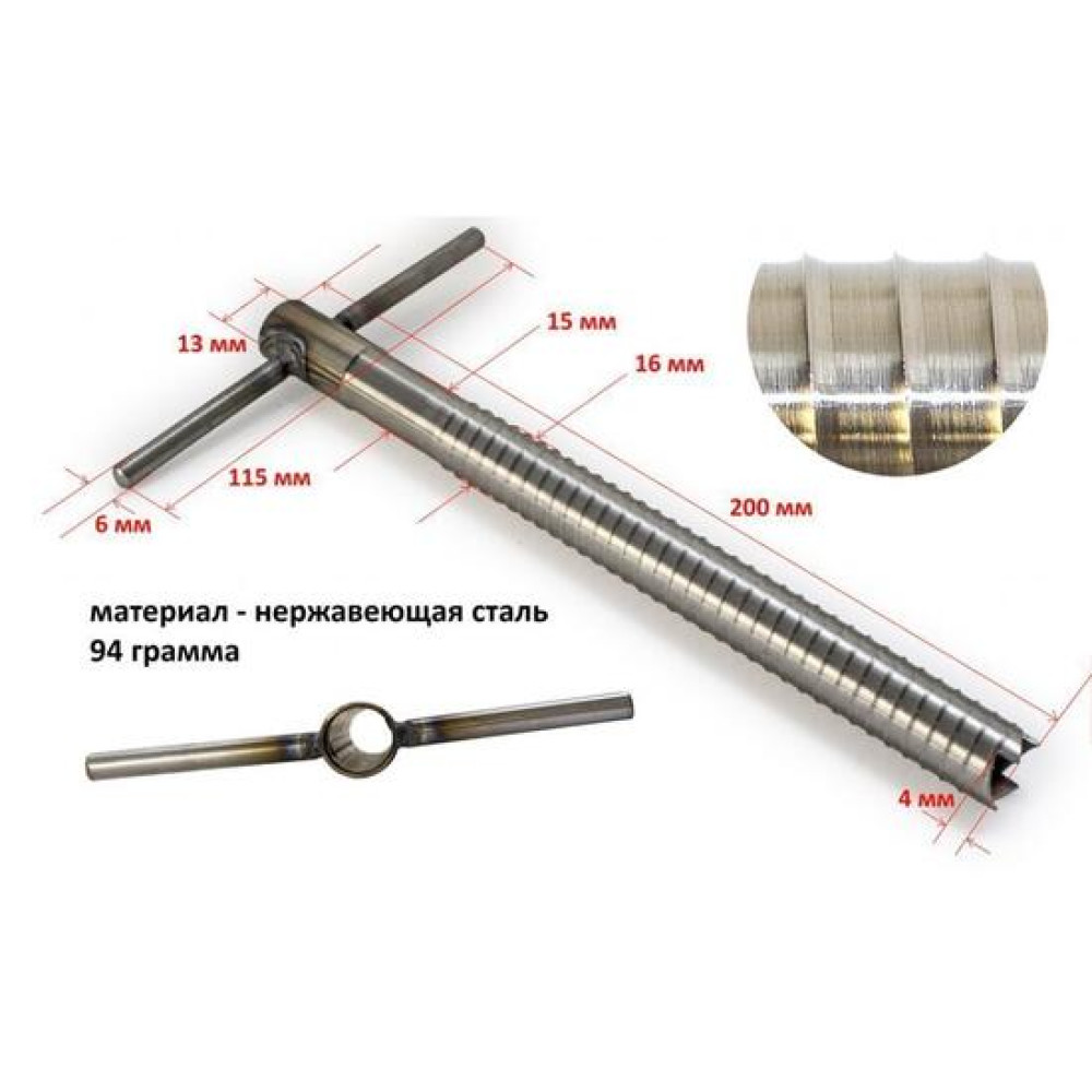 Основные характеристики: Ввертыш изготовлен из нержавеющей сталиДиаметр трубки с резьбой - 16 ммВысота «режущих зубцов» на резьбе - 0,5 ммТолщина стенки трубки - 1,0 ммДлина трубки - 130 ммДлина ручки - 115 мм Внимание! По всем геометрическим размерам, указанным в характеристиках и описании изделия допустимы отклонения до +/- 5%.