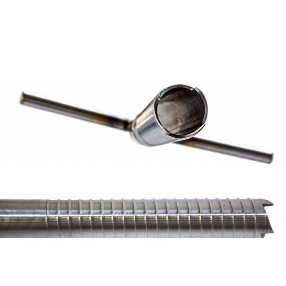 Ввертыш для зимней палатки имеет специальную конструкцию в виде полой трубки с наружной резьбой и острыми зазубринами на конце, которая позволяет с легкостью ввинчивать ввертыш в твердый лед