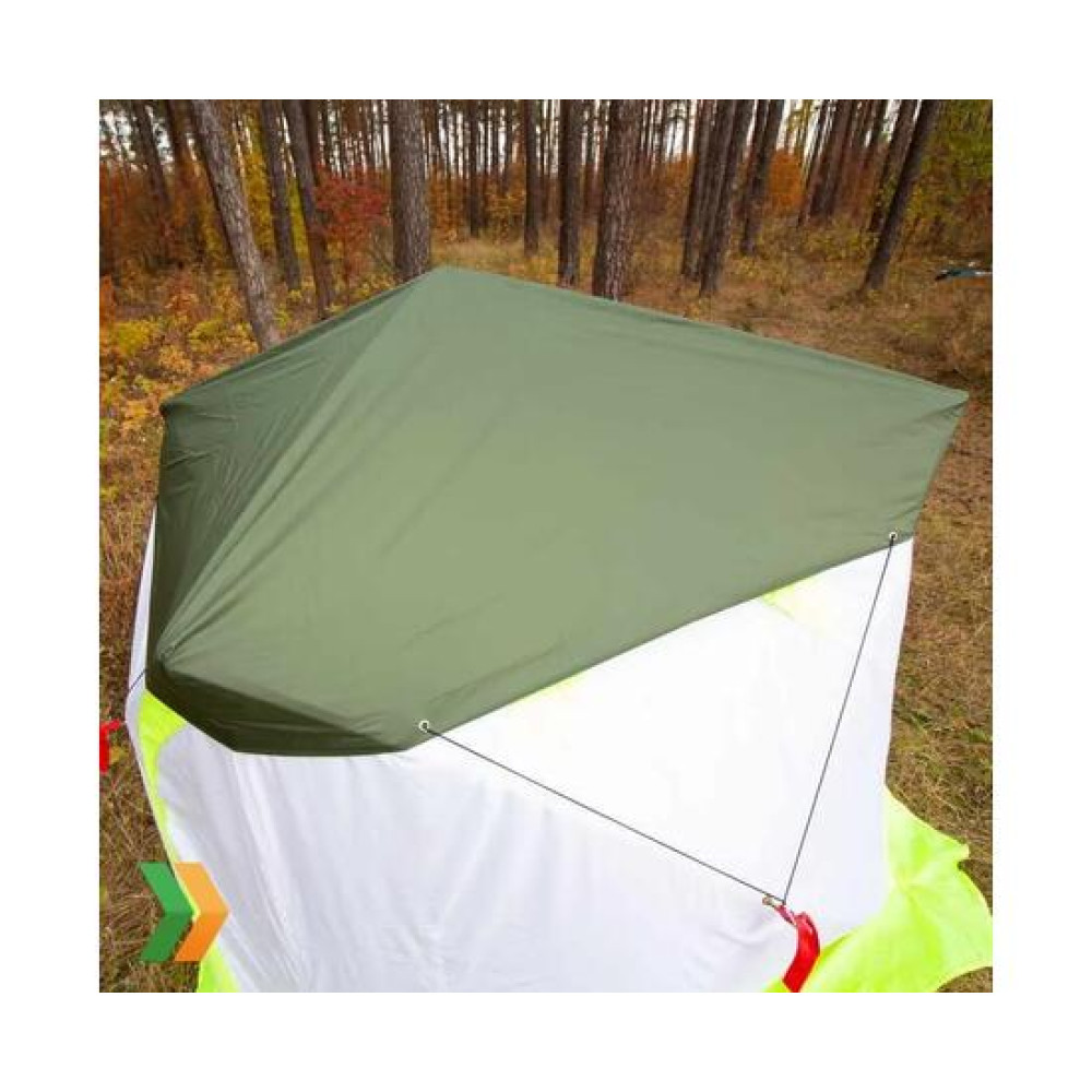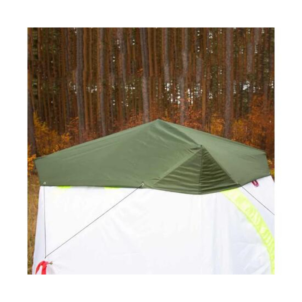 Крепится оттяжками к хабам палатки с помощью карабинов